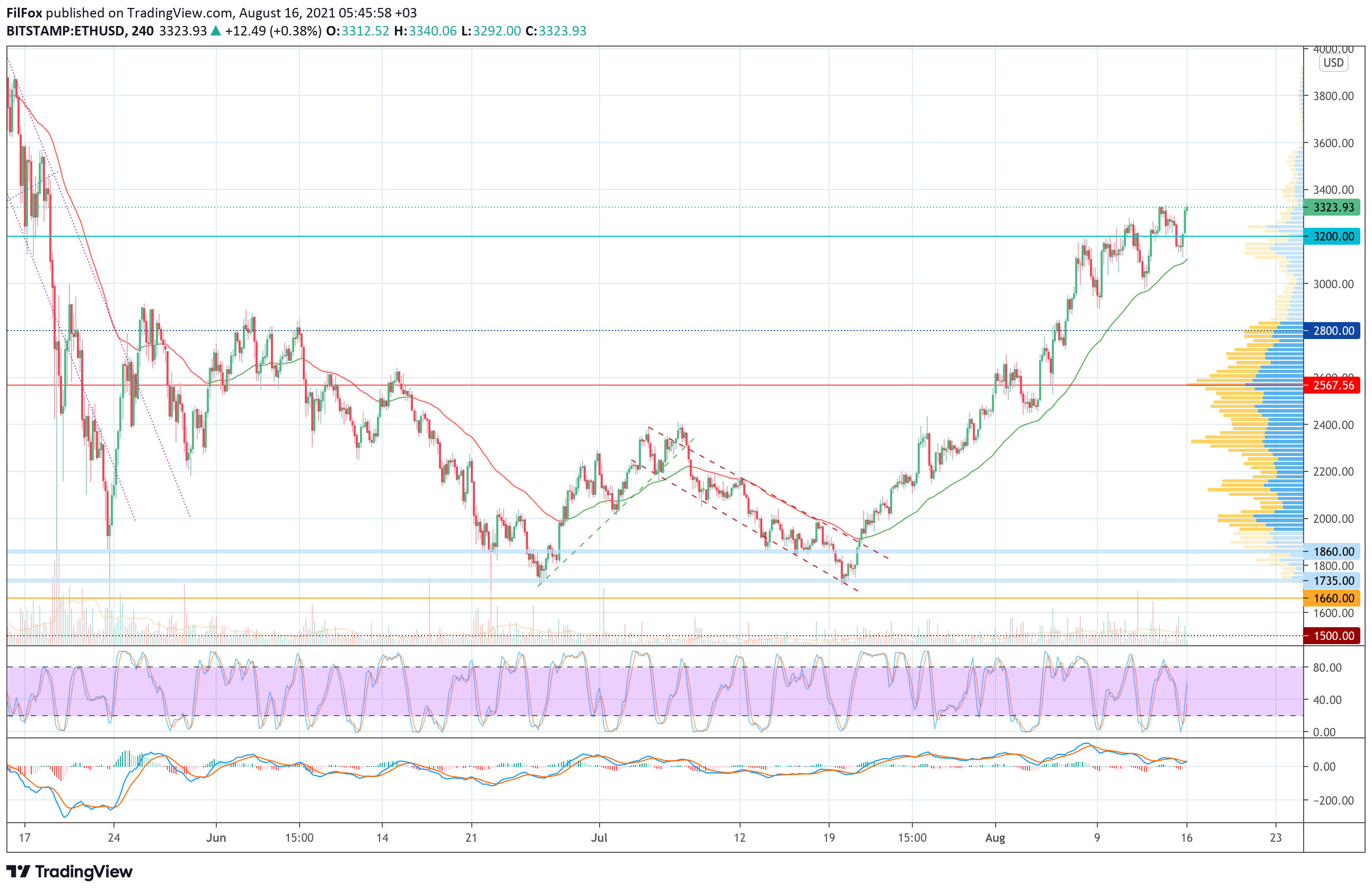 В конце прошедшей недели покупатели не смогли пробиться выше отметки 3333.33 USD, и цена Ethereum откатилась в область четырёхчасовой EMA55.