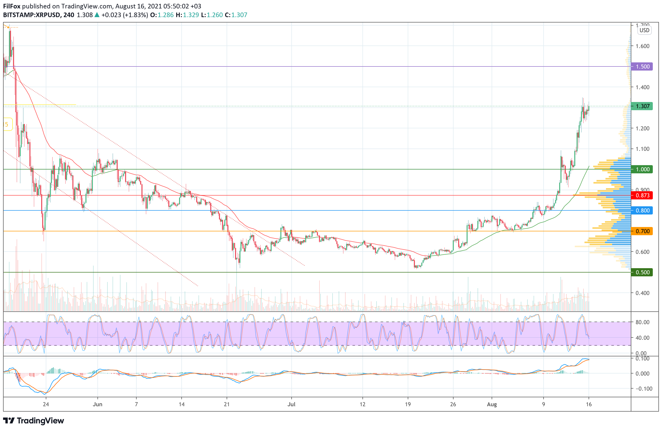 В субботу утром, после непродолжительной консолидации, цена XRP пробила сопротивление 1.150 USD и продолжила рост выше уровня 1.200 USD. В конце прошедшей недели быки смогли обновить летний максимум до отметки 1.350 USD.