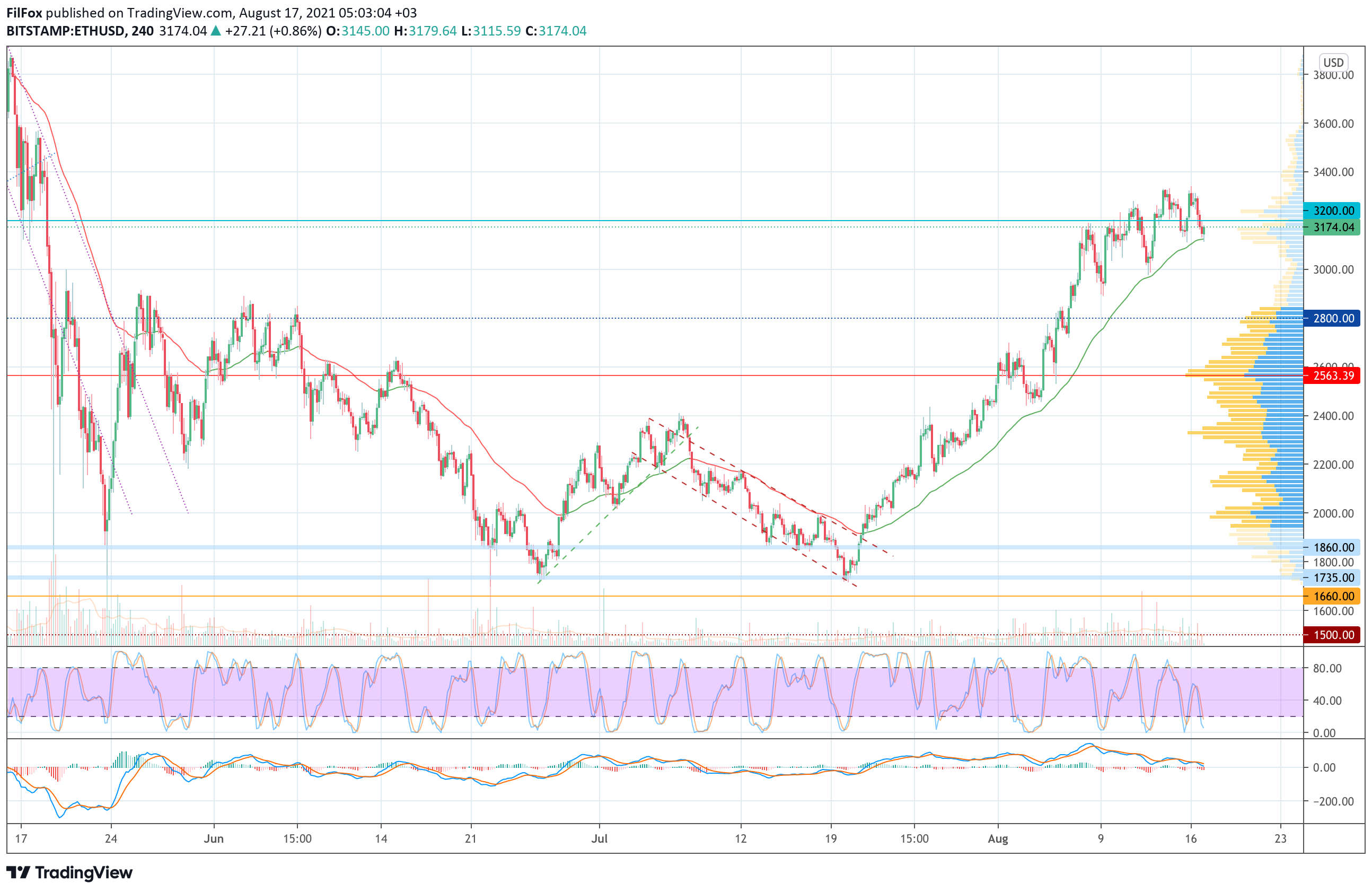 Вчера медведи оттеснили цену Ethereum ниже ключевой поддержки 3200.00 USD. Ночью откат продолжился к четырёхчасовой EMA55.
