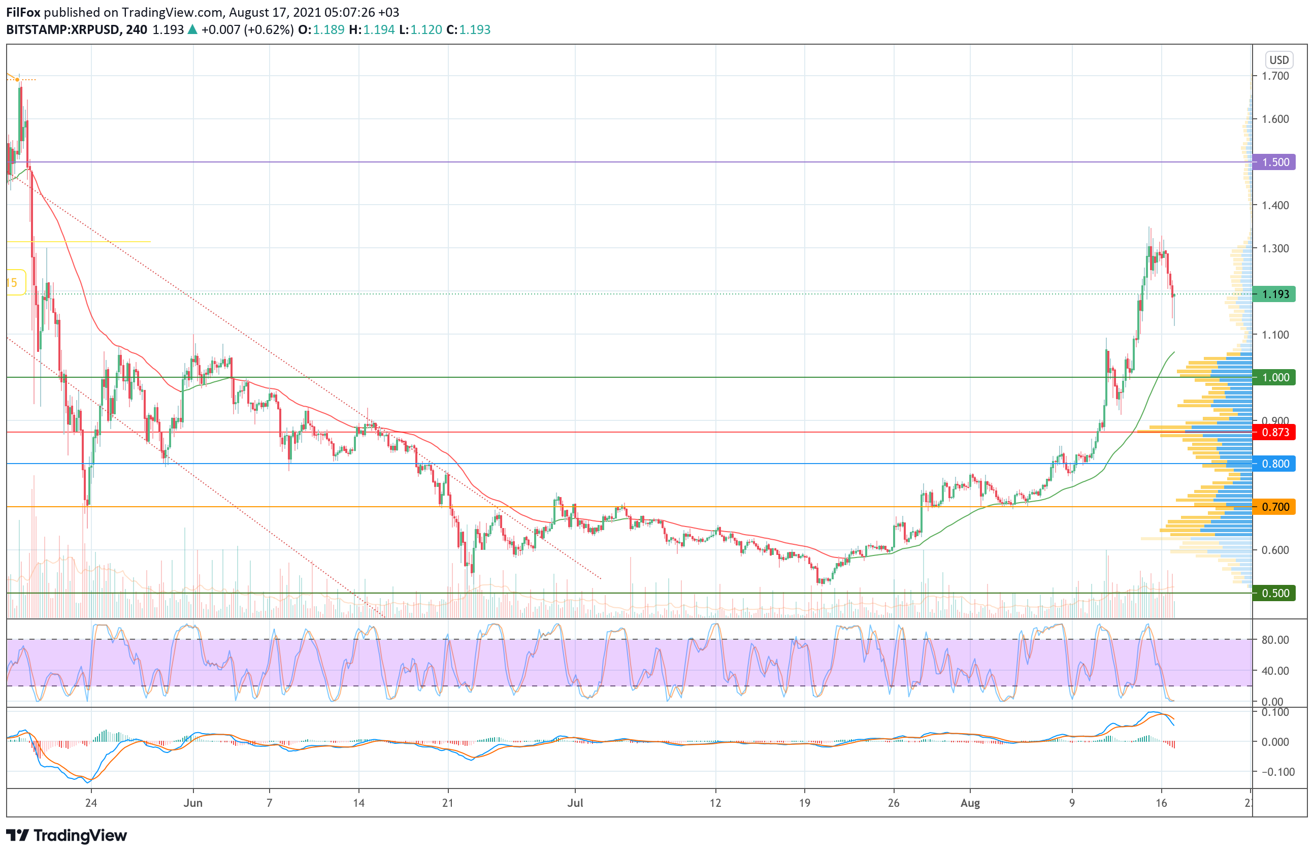 Вчера объёмы покупок были ниже среднего уровня и покупатели провалили попытку обновить месячный максимум. Цена XRP откатилась к поддержке 1.200 USD, а ночью снижение продолжилось в область 1.150 USD.