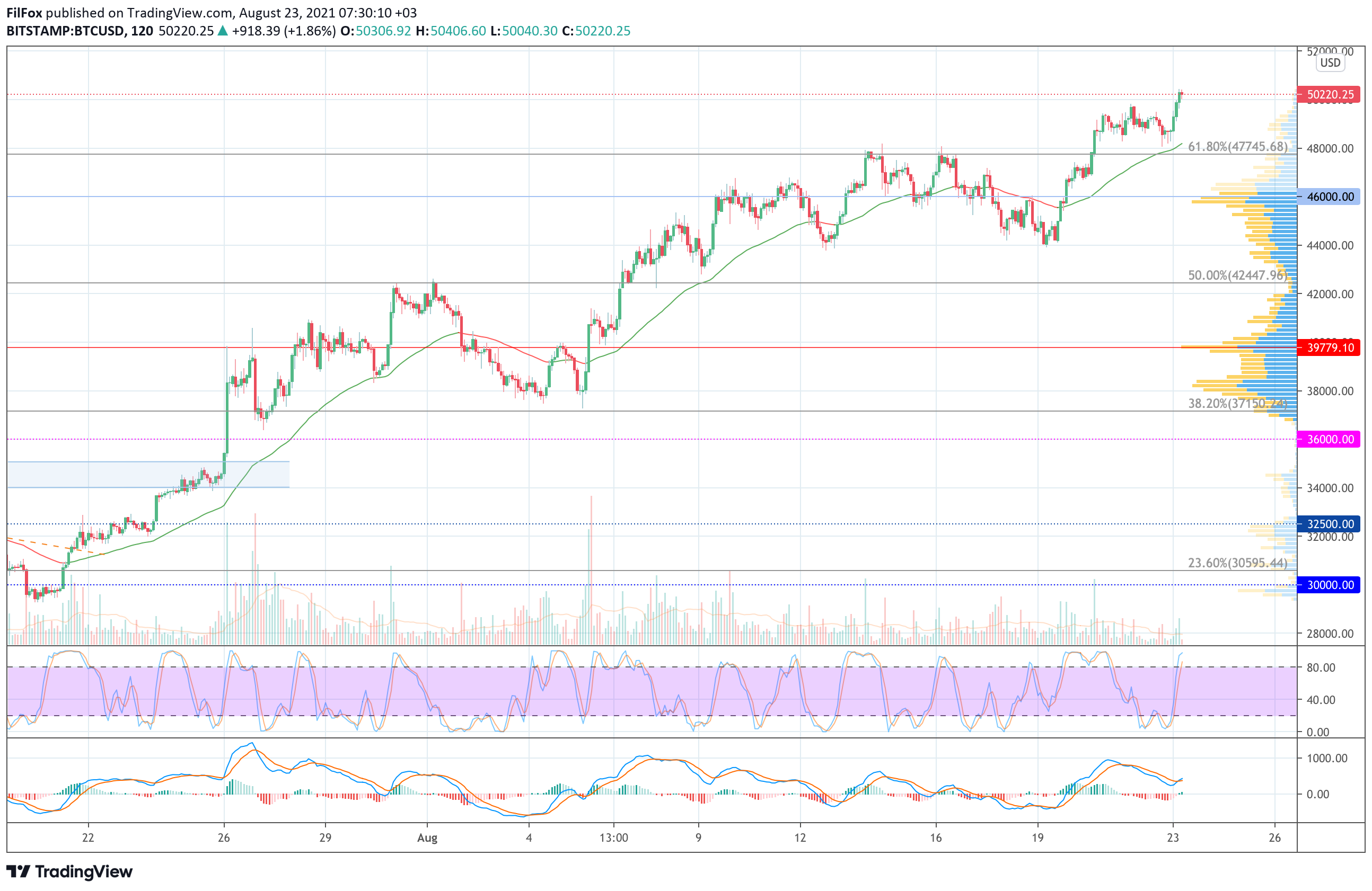 Сегодня ночью быки пошли в атаку и на утро цена Bitcoin пробила психологический рубеж 50000.00 USD. Месячный максимум установлен на отметке 50438.00 USD.