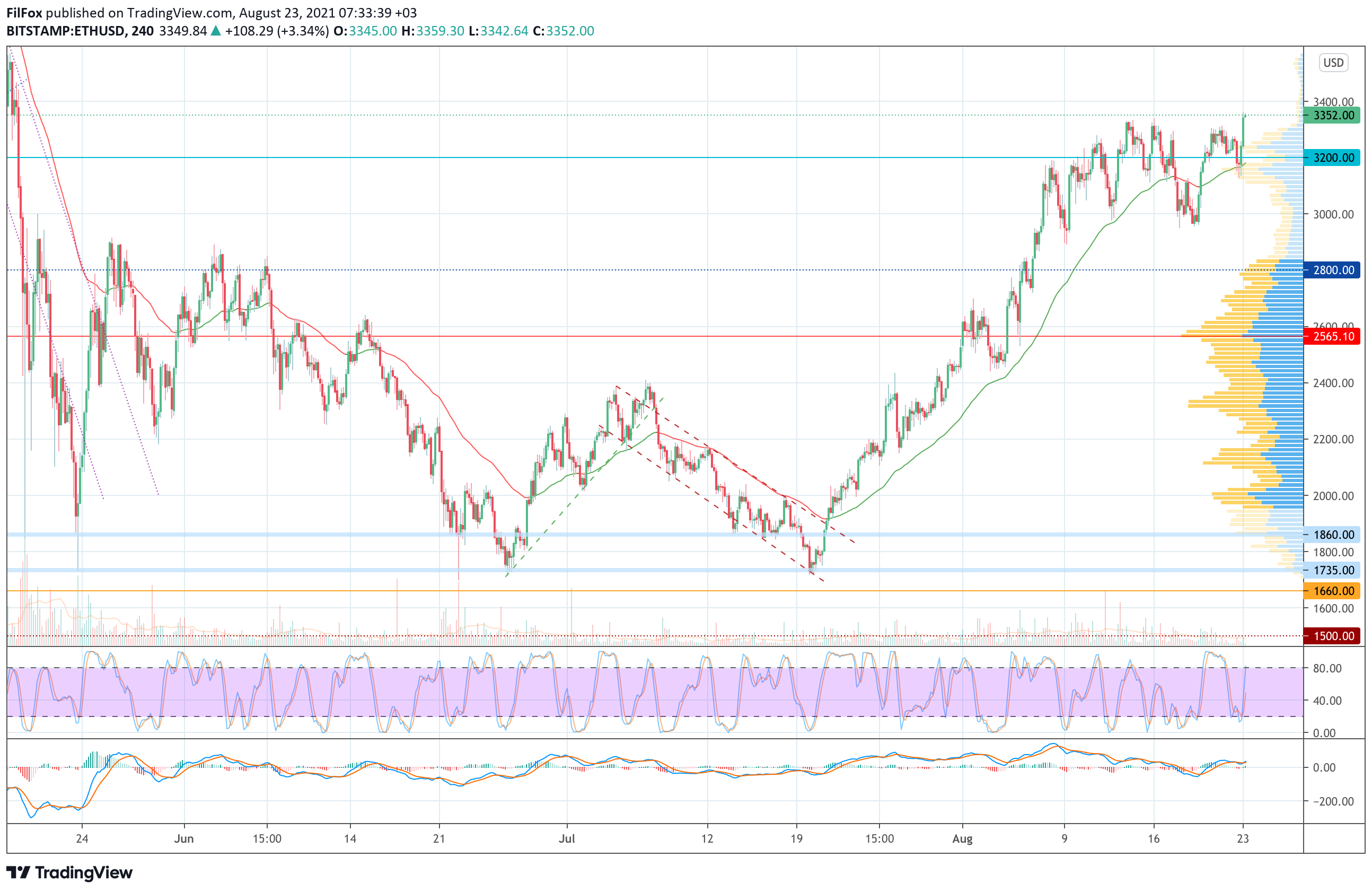 В минувшее воскресенье объёмы торгов были довольно мелкие и цена Ethereum откатилась ниже поддержки 3200.00 USD. Продавцы прокололи четырёхчасовую EMA55 и установили дневной минимум в точке 3130.00 USD.