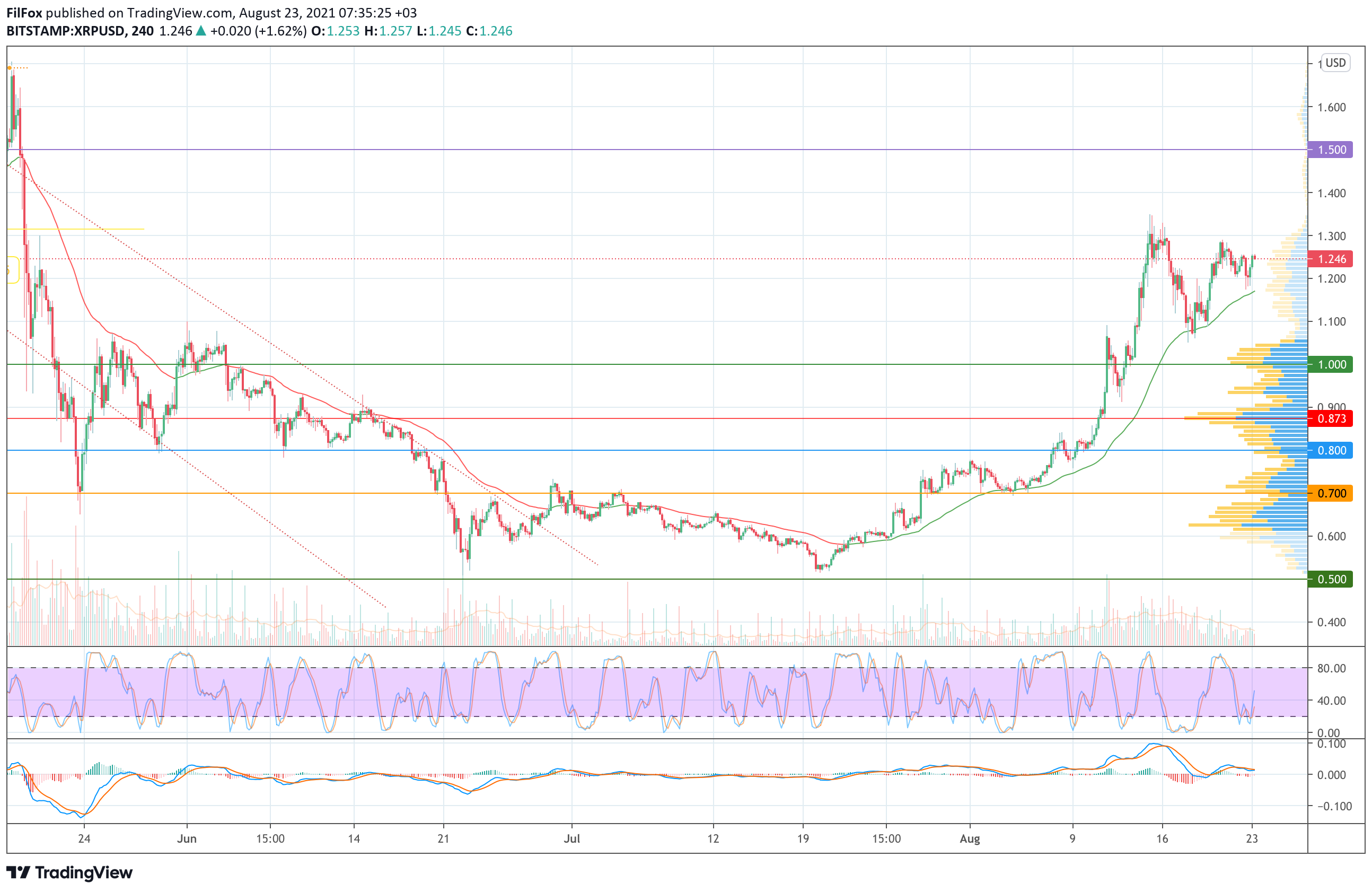 В конце прошедшей недели цена XRP консолидировалась в узком боковом диапазоне, нижняя граница которого находилась на уровне поддержки 1.200 USD, а сверху продавцы не пропускали цену в зону недельного максимума (отметка 1.300 USD).
