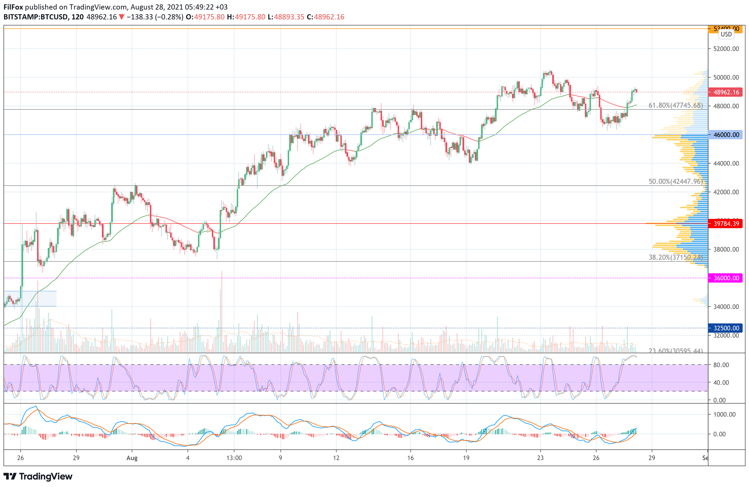 Вчера в течение дня покупатели пытались восстановить цену биткоина, и вечером они смогли преодолеть двухчасовую EMA55. До конца дня пара закрепилась выше уровня средних цен, а ночью рост продолжился к отметке 49325.00 USD.