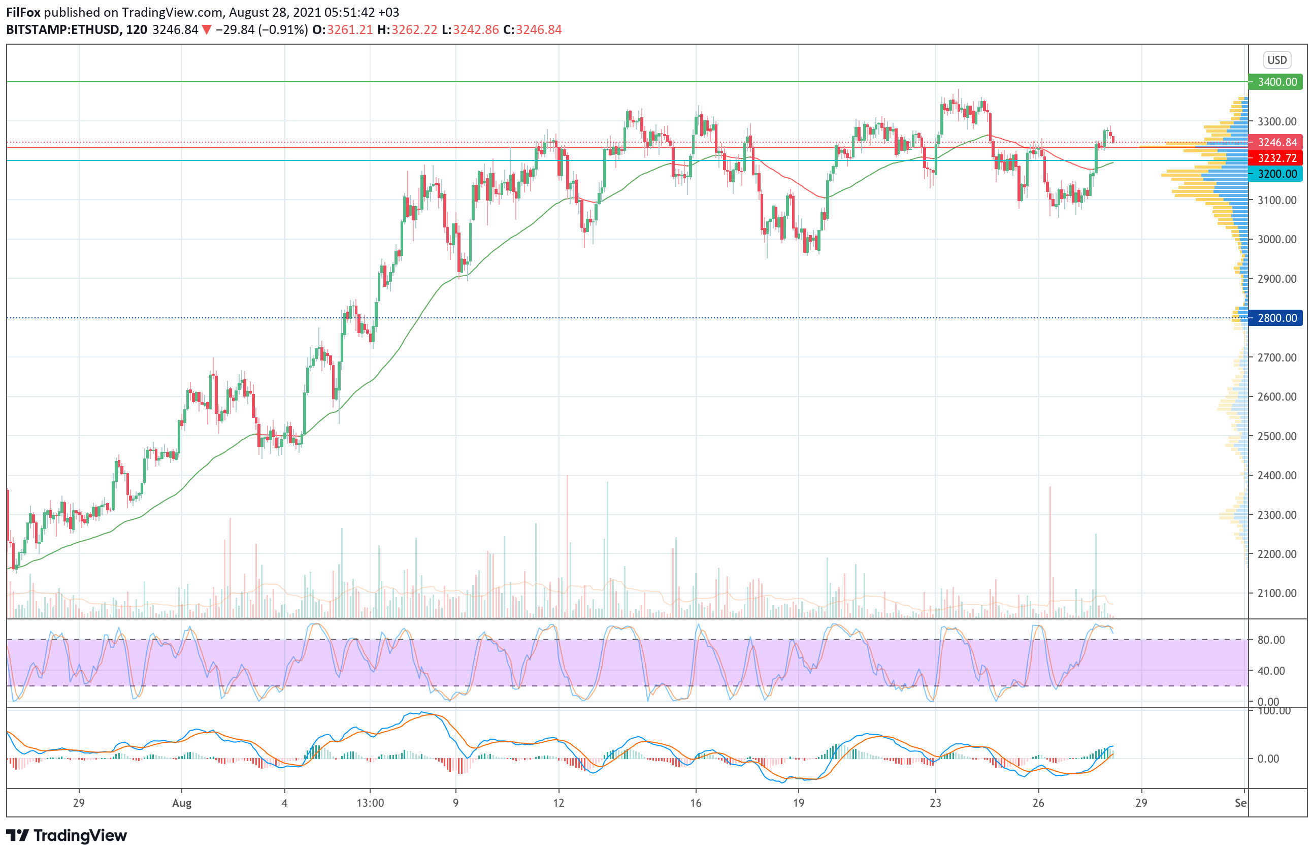 Вчера быки смогли нарастить объёмы, и цена Ethereum восстановилась выше двухчасовой EMA55. Бычий импульс пробил сопротивление 3200.00 USD, установив ночью максимум в точке 3280.00 USD.