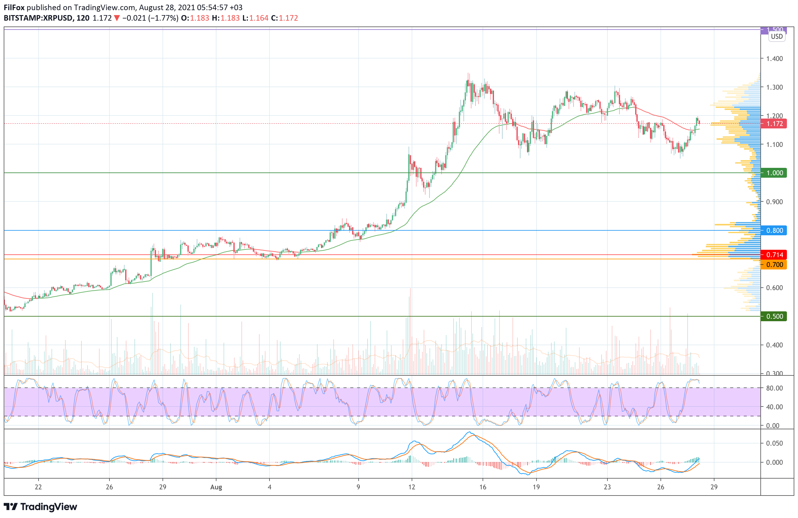 На утро быки уперлись в сопротивление 1.200 USD и цена немного откатилась. Откат может вернуть пару к скользящей средней EMA55, и если она остановит снижение, то в эти выходные можно рассчитывать на восстановление в область августовского максимума.