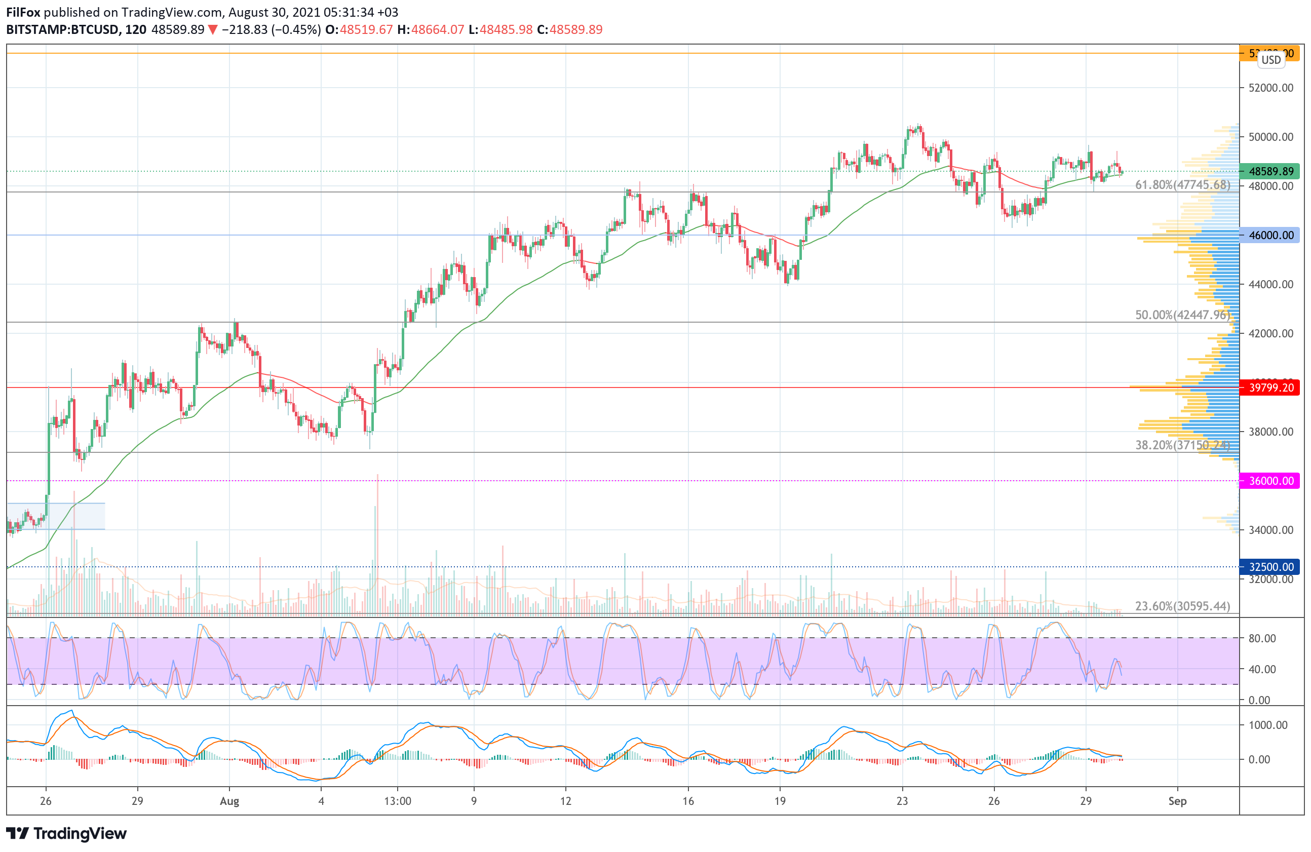 В воскресенье, утром, медведи отбили атаку покупателей и откатили пару ниже двухчасовой EMA55, прижав цену BTC к уровню 61.8% фибо (47745.68 USD). Во второй половине дня пара постепенно восстановилась выше уровня средних цен, но покупатели пока так и не смогли сформировать бычий импульс, чтобы протестировать уровень 50 тысяч долларов.