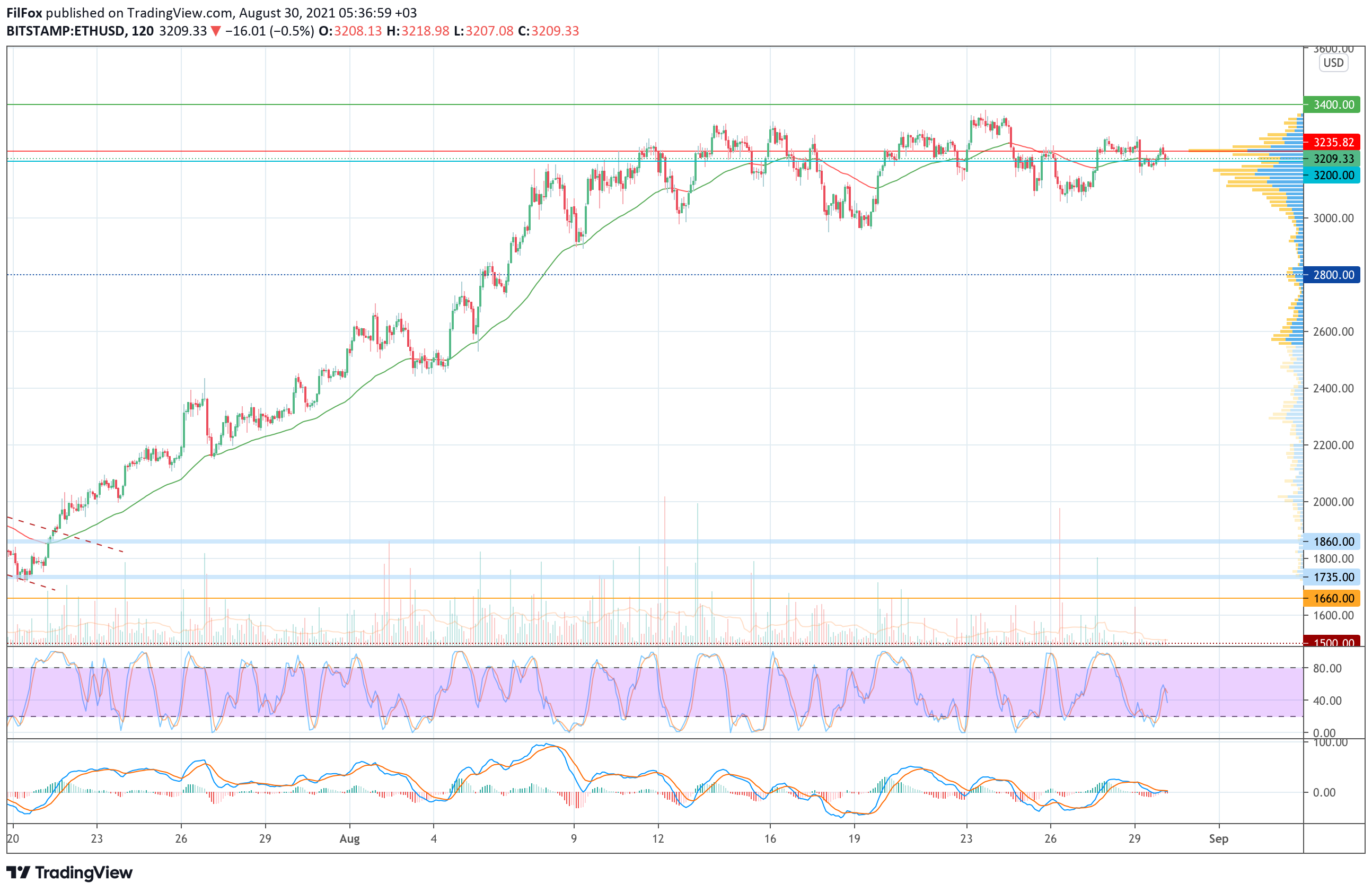 В субботу покупатели удерживали цену Ethereum выше отметки 3200.00 USD, а в воскресенье медведям удалось оттеснить пару ниже этой поддержки и протестировать уровень 3150.00 USD.