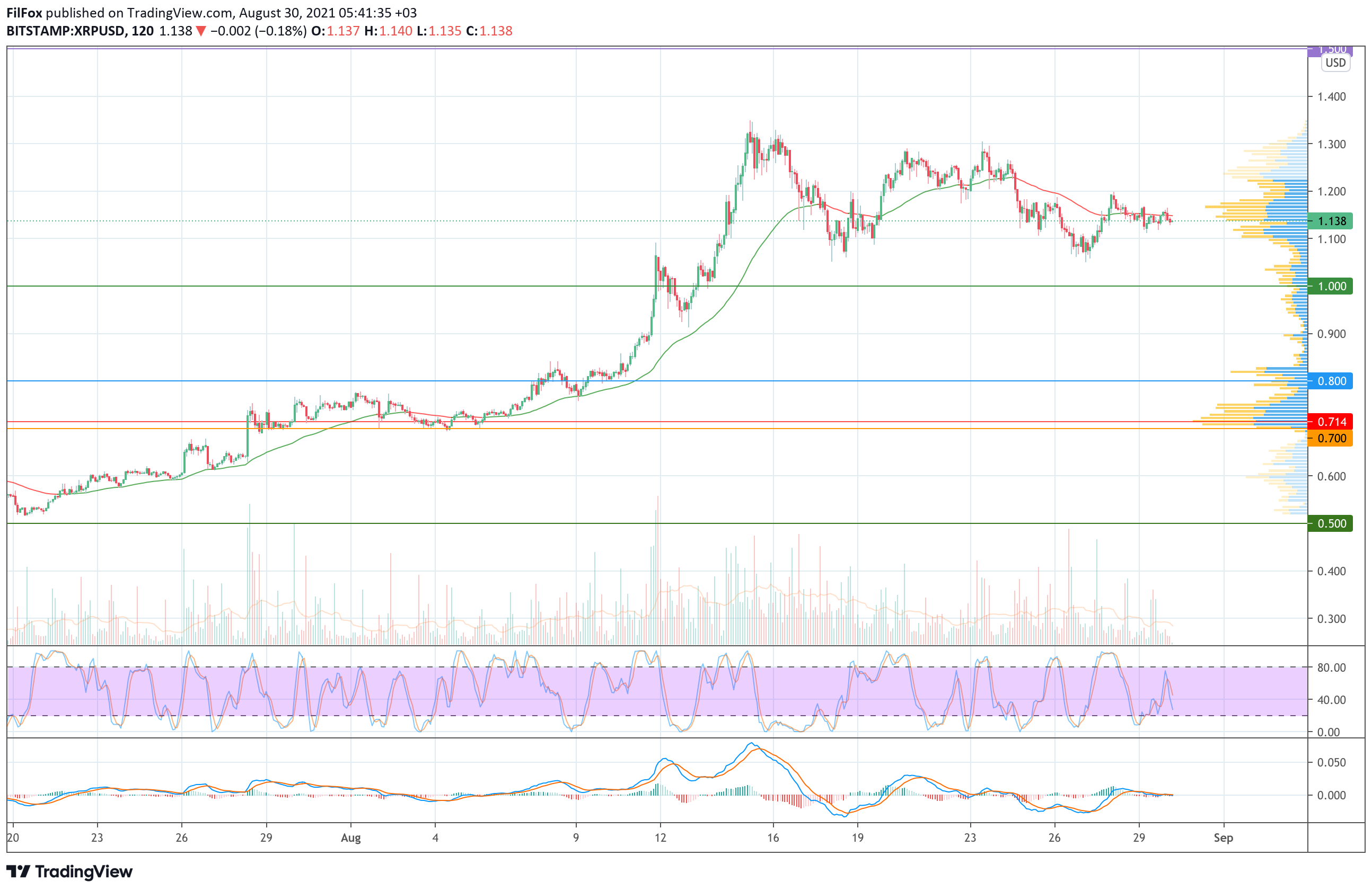 На выходных цена XRP консолидировалась в достаточно узком боковом диапазоне на уровне двухчасовой EMA55. Несмотря на доминирование продавцов пара пытается удержаться в области средних цен. Если медвежье давление усилится, то возможен откат к психологической отметке 1.00 USD.