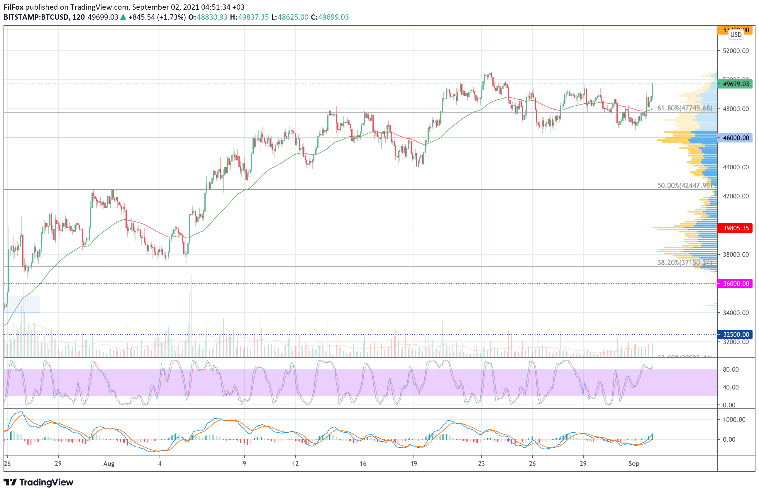Во второй половине дня покупатели сформировали мощный бычий импульс и преодолели уровень 61.8% фибо (47745.68 USD). Сегодня ночью рост продолжился и цена биткоина вплотную подошла к психологической отметке 50000.00 USD.