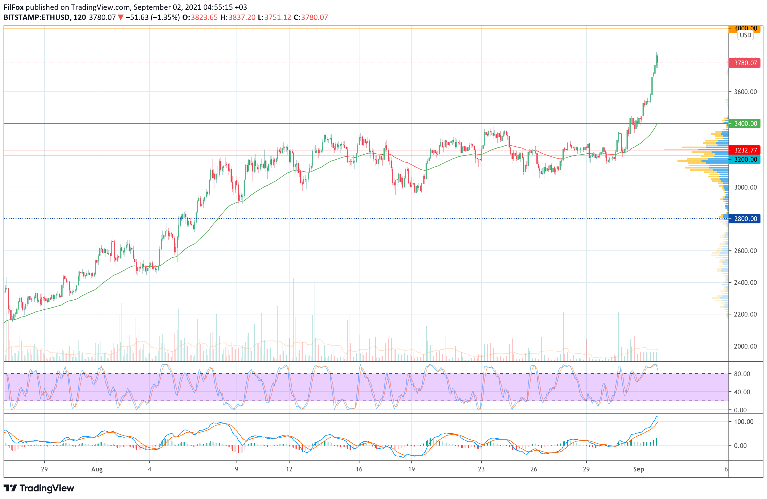 Вчера утром цена Ethereum продолжила рост и ещё до обеда преодолела сопротивление в районе отметки 3520.00 USD. Во второй половине дня быки усилили натиск и дневной максимум зафиксирован в районе отметки 3790.00 USD. Сегодня ночью объёмы покупок постепенно сократились, но быки смогли продолжить забег к новому максимуму в области 3850.00 USD.