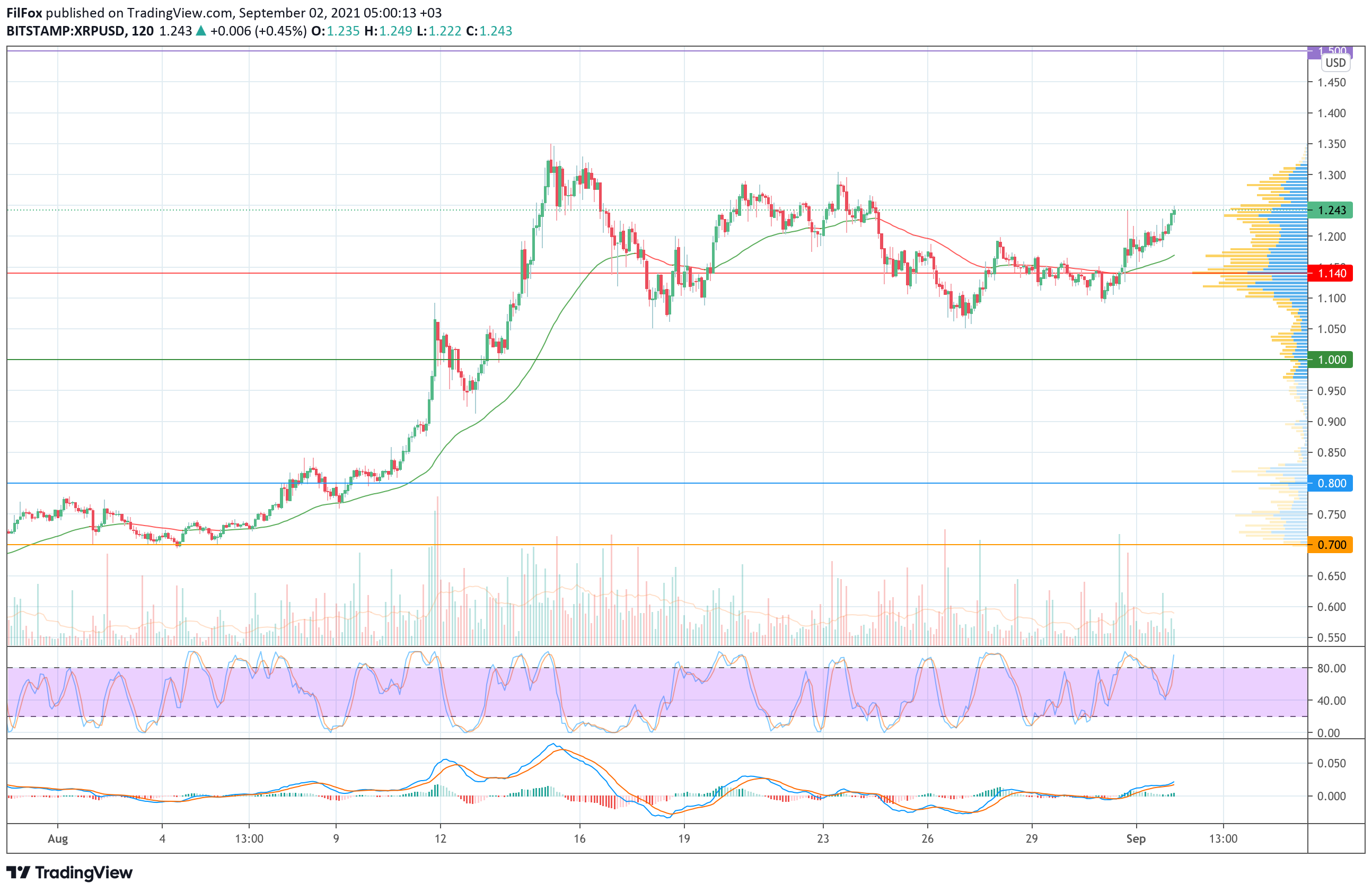 Вчера цена XRP смогла удержаться выше линии POC (1.140 USD) и покупатели смогли продолжить восстановление пары. Рост не был динамичным и не поддержан крупными объёмами, поэтому на сегодняшнее утро цена ещё не успела добраться до прогнозного уровня 1.300 USD.