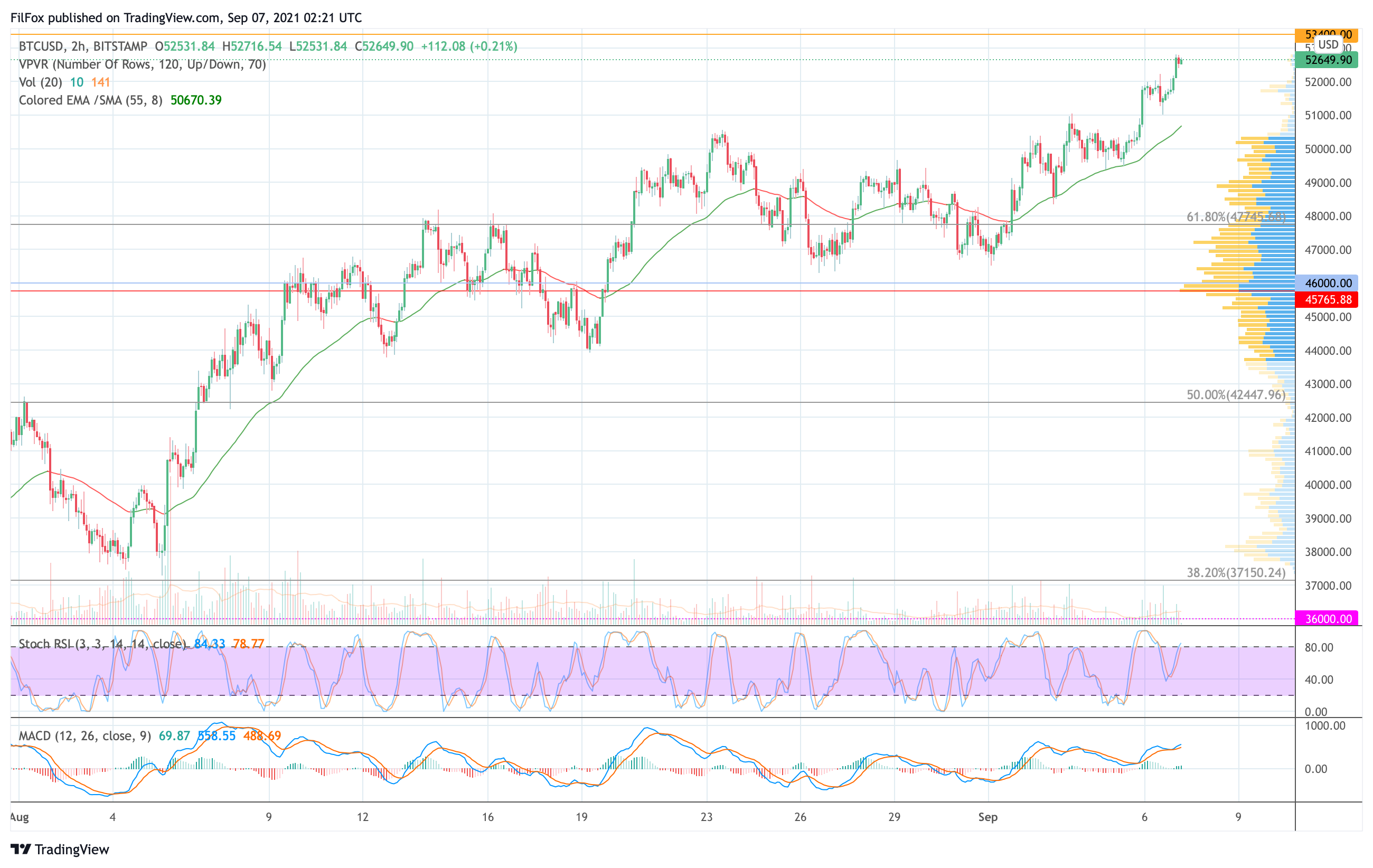После отката к поддержке 51000.00 USD быки продолжили забег и прорвали сопротивление 52000.00 USD, установив на сегодняшнее утро месячный максимум выше уровня 52800.00 USD. Рост проходил без поддержки крупных покупателей, поэтому цена биткоина до сих пор ещё не успела протестировать оранжевое сопротивление 53400.00 USD.