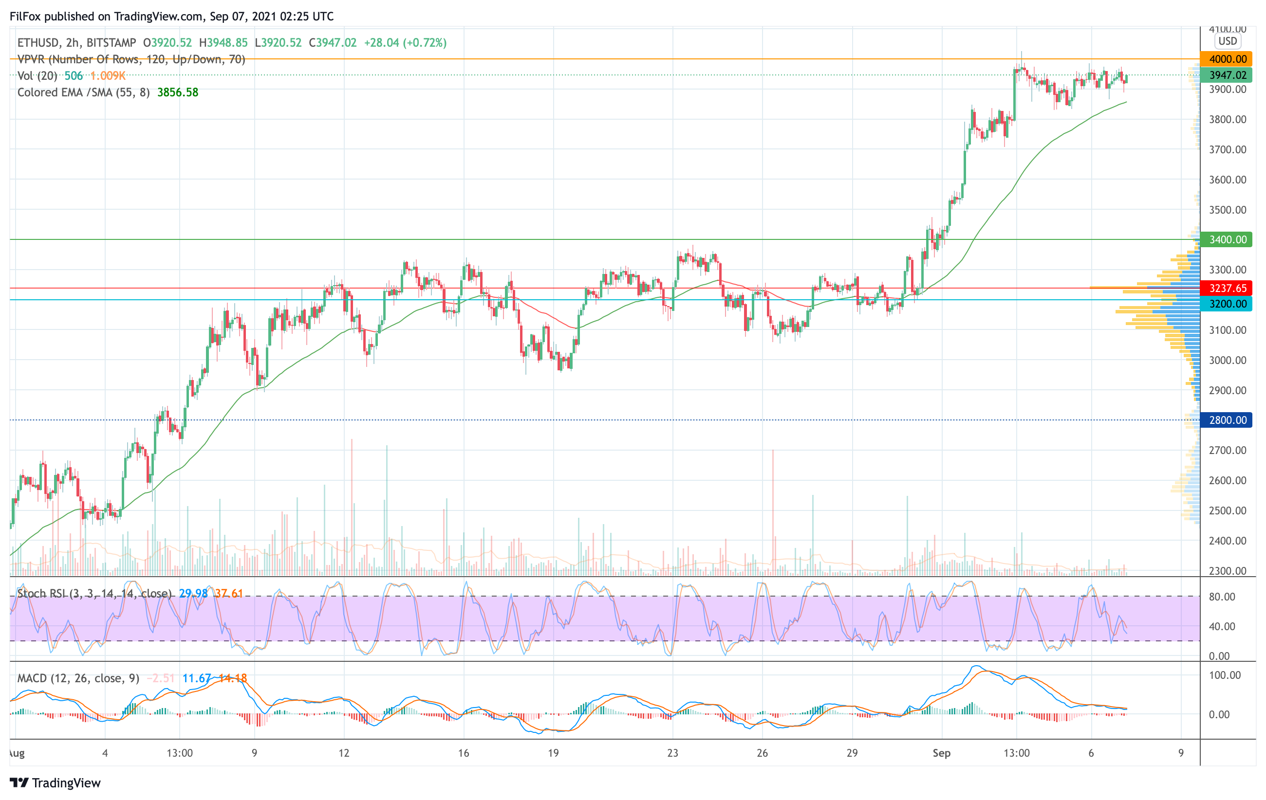 Цена Ethereum не смогла вчера продолжить рост и весь день находилась в боковой консолидации под психологическим уровнем 4000.00 USD. Объёмы торгов существенно сократились, и диапазон консолидации немного сузился.