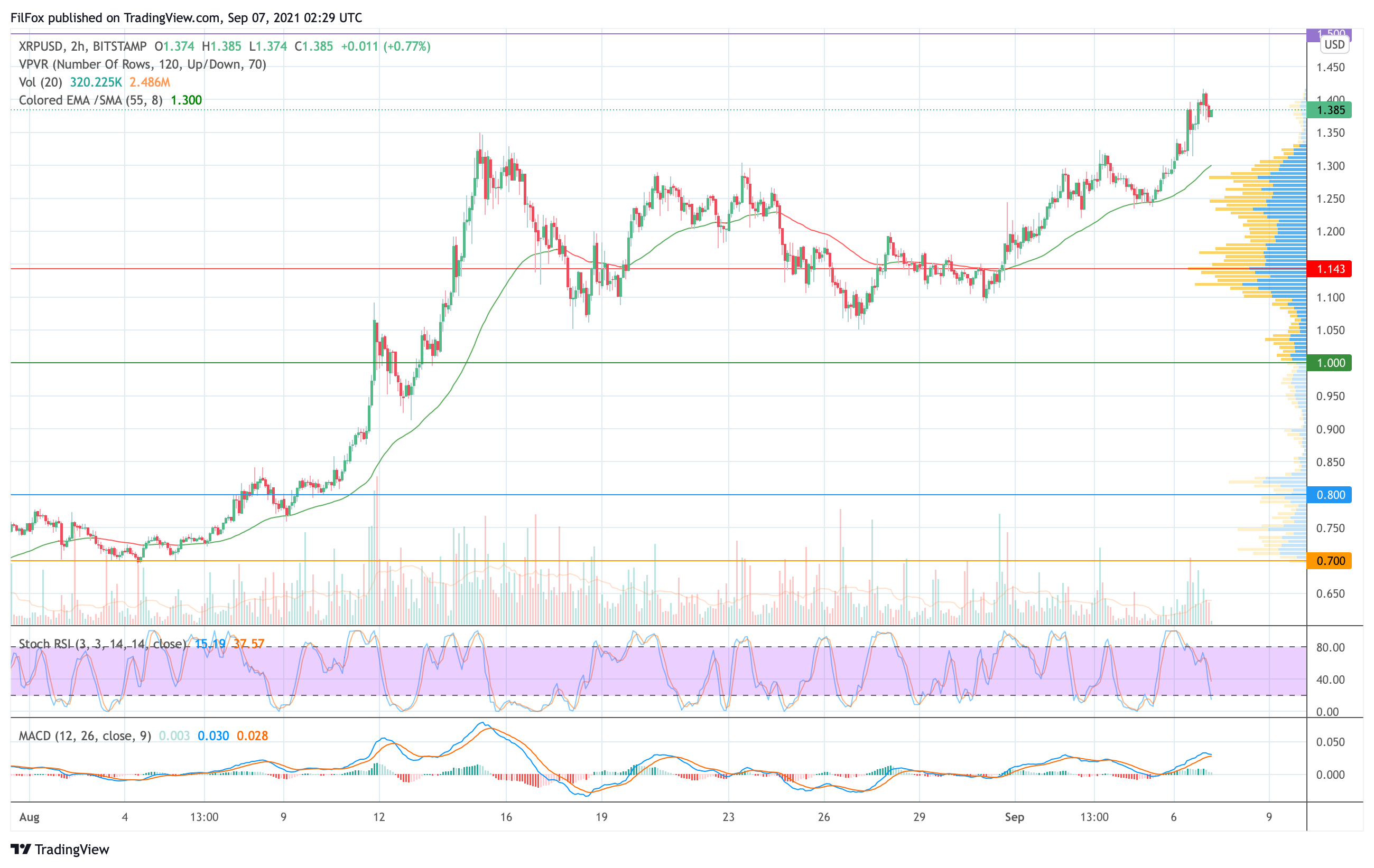 Вчера утром цена XRP приостановила снижение в районе отметки 1.315 USD и попыталась продолжить восстановление в зону летнего максимума. В первой половине дня покупатели сформировали бычий импульс и пробили сопротивление 1.350 USD.
