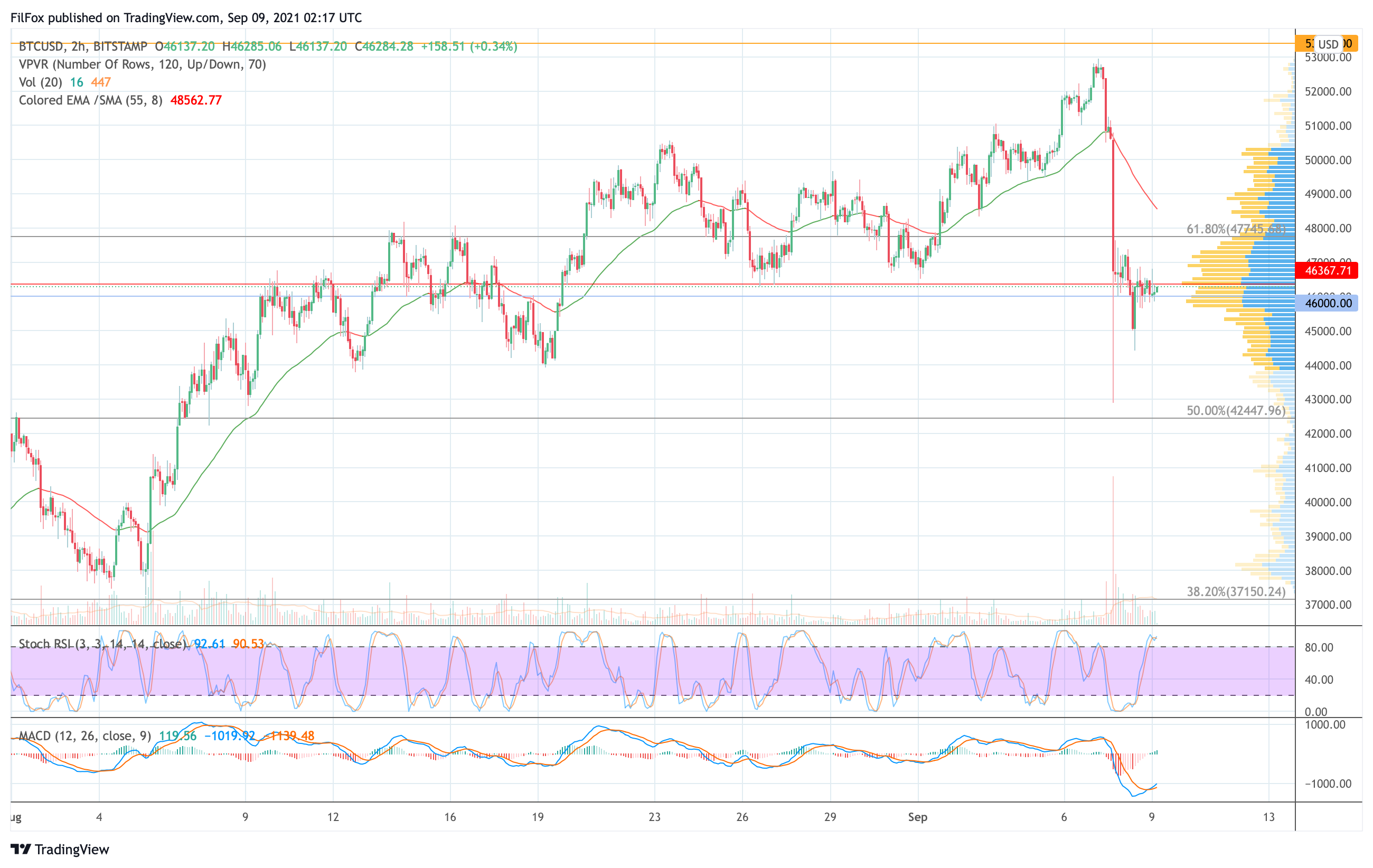 Во второй половине дня покупатели вернули пару к поддержке 46000.00 USD и до сегодняшнего утра цена пытается удержаться на этом уровне в узкой консолидации.
