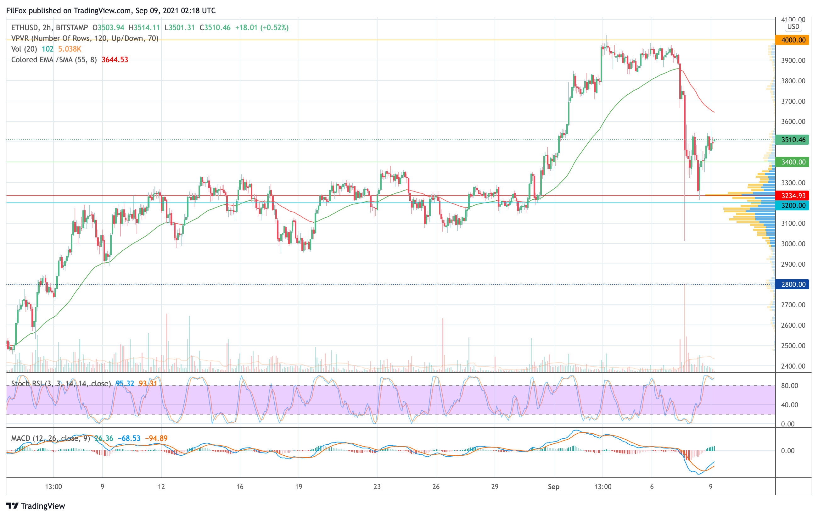 После этого пара постепенно восстановилась выше уровня 3400.00 USD, а вечером цена ETH вернулась в область консолидации на отметке 3500.00 USD.