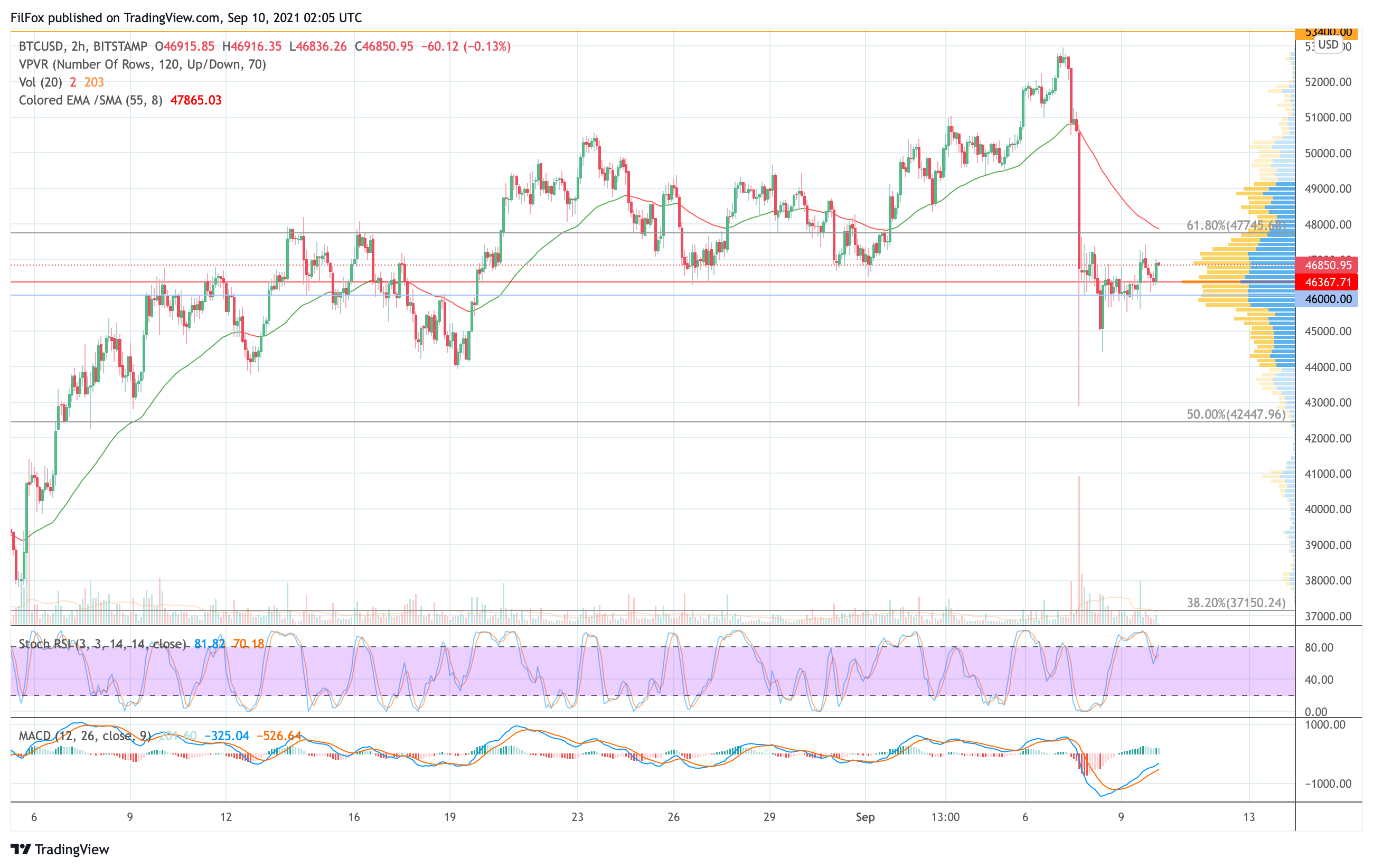 Вчера в первой половине дня цена биткоина находилась в боковой консолидации с поддержкой на уровне 46000.00 USD. Днём покупатели предприняли попытку протестировать уровень 61.8% фибо (47745.68 USD), но до завершения дня пара так и не смогла восстановиться в область двухчасовой EMA55.