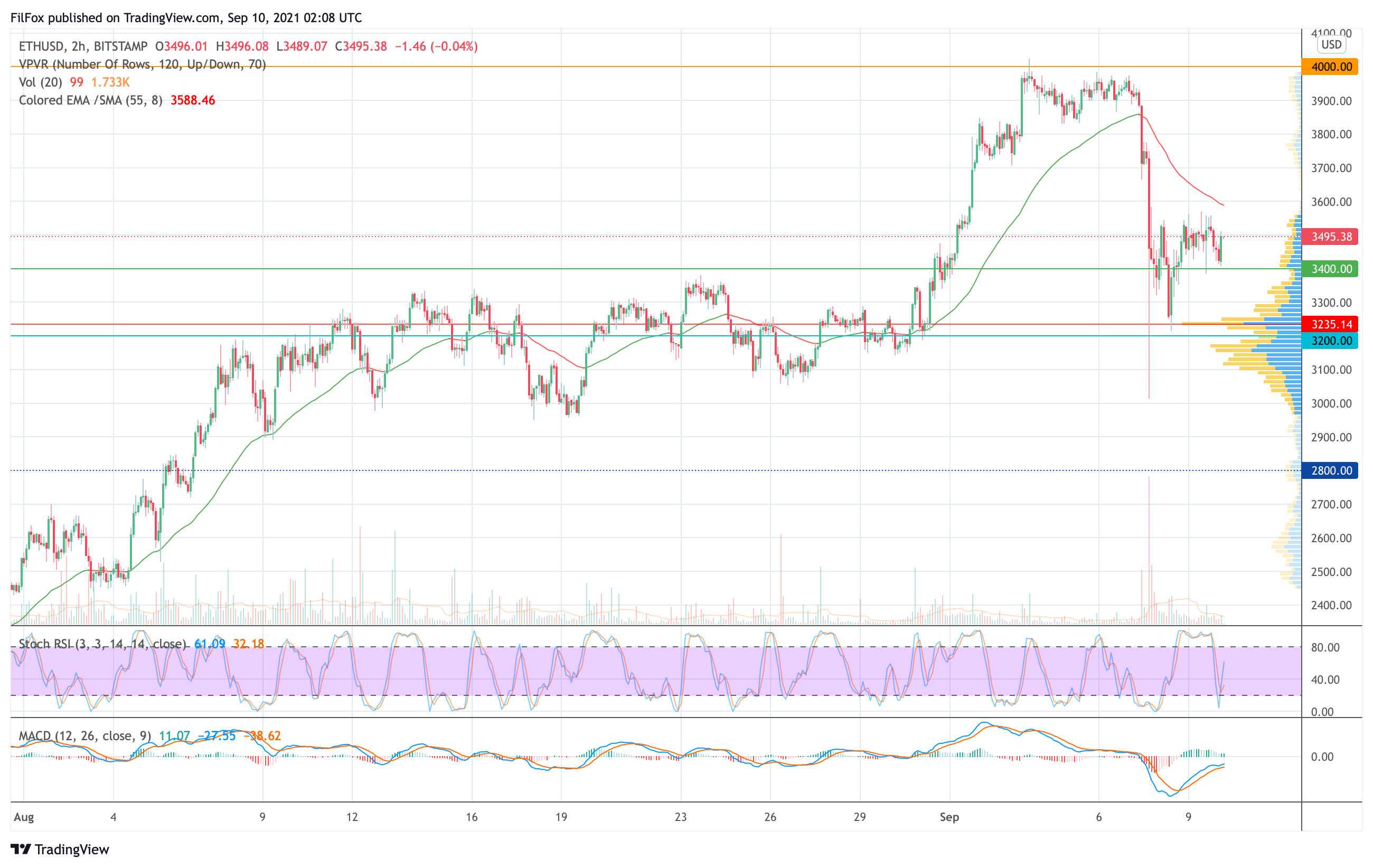 Вчера цена Ethereum пыталась удержаться в боковом диапазоне с поддержкой на уровне 3400.00 USD. В течение дня объёмы торгов были небольшие, но участники рынка пытались расширить границы бокового диапазона.