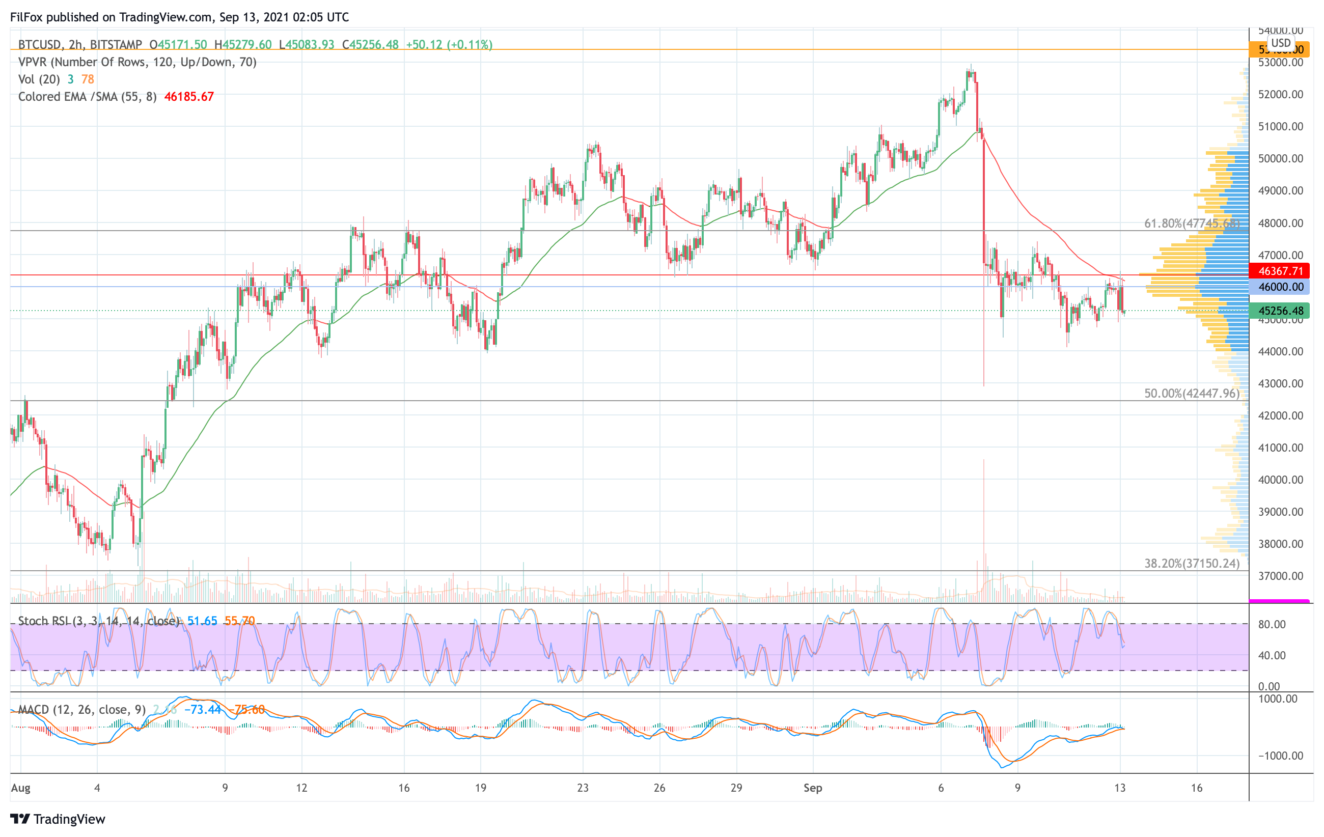 В минувшую субботу цена биткоина консолидировалась в районе отметки 45000.00 USD, а в воскресенье покупатели попытались преодолеть сопротивление 46000.00 USD. Цена проколола этот уровень, но рост не был поддержан крупными объёмами, и пара не смогла преодолеть двухчасовую EMA55.