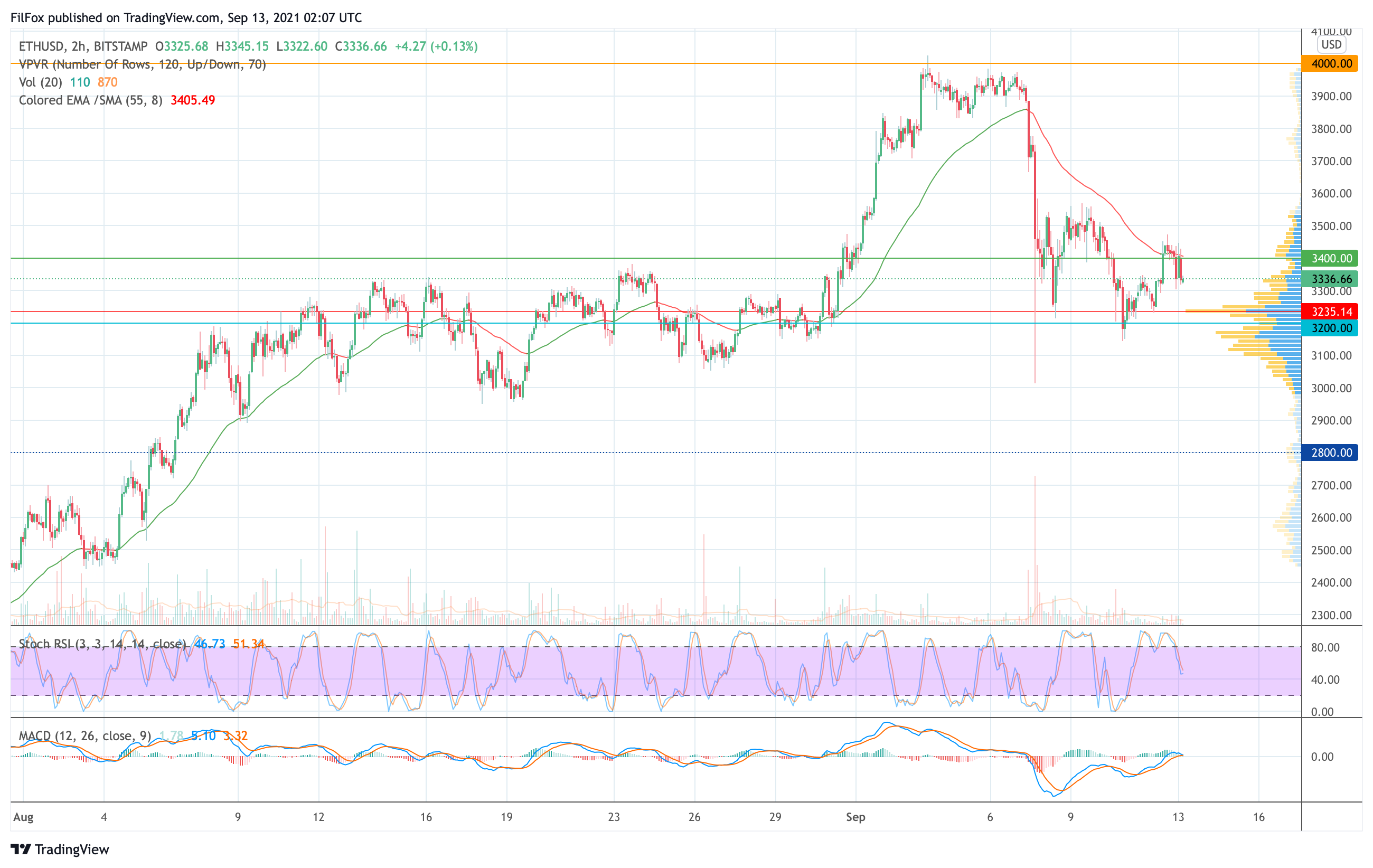 На прошедших выходных цена Ethereum восстановилась выше зелёного сопротивления 3400.00 USD, но до конца недели пара так и не смогла закрепиться над двухчасовой EMA55.