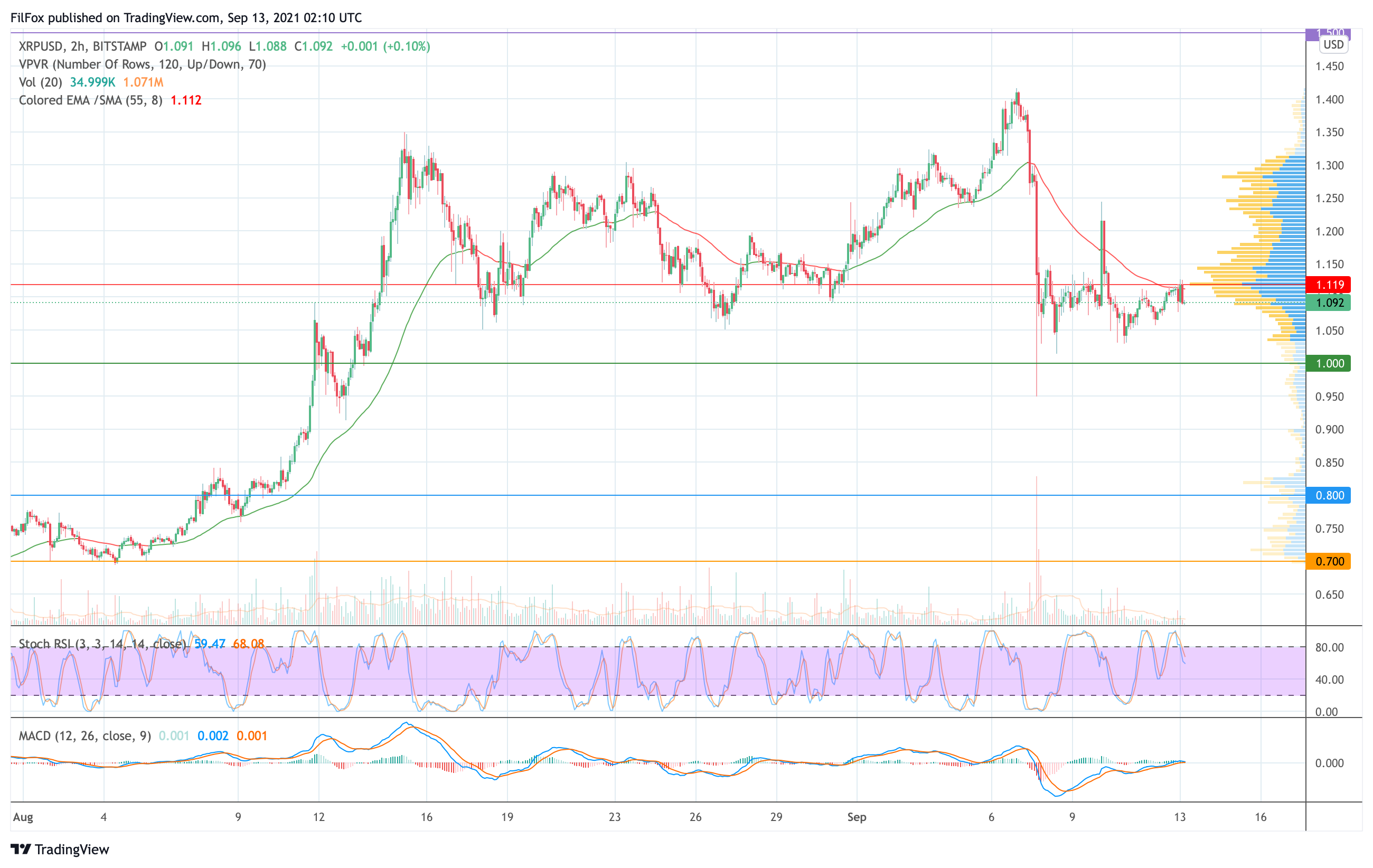 На выходных цена XRP постепенно восстановилась к линии POC (1.119 USD), но крупный покупатель не поддержал рост, и пара не смогла преодолеть скользящую среднюю EMA55.