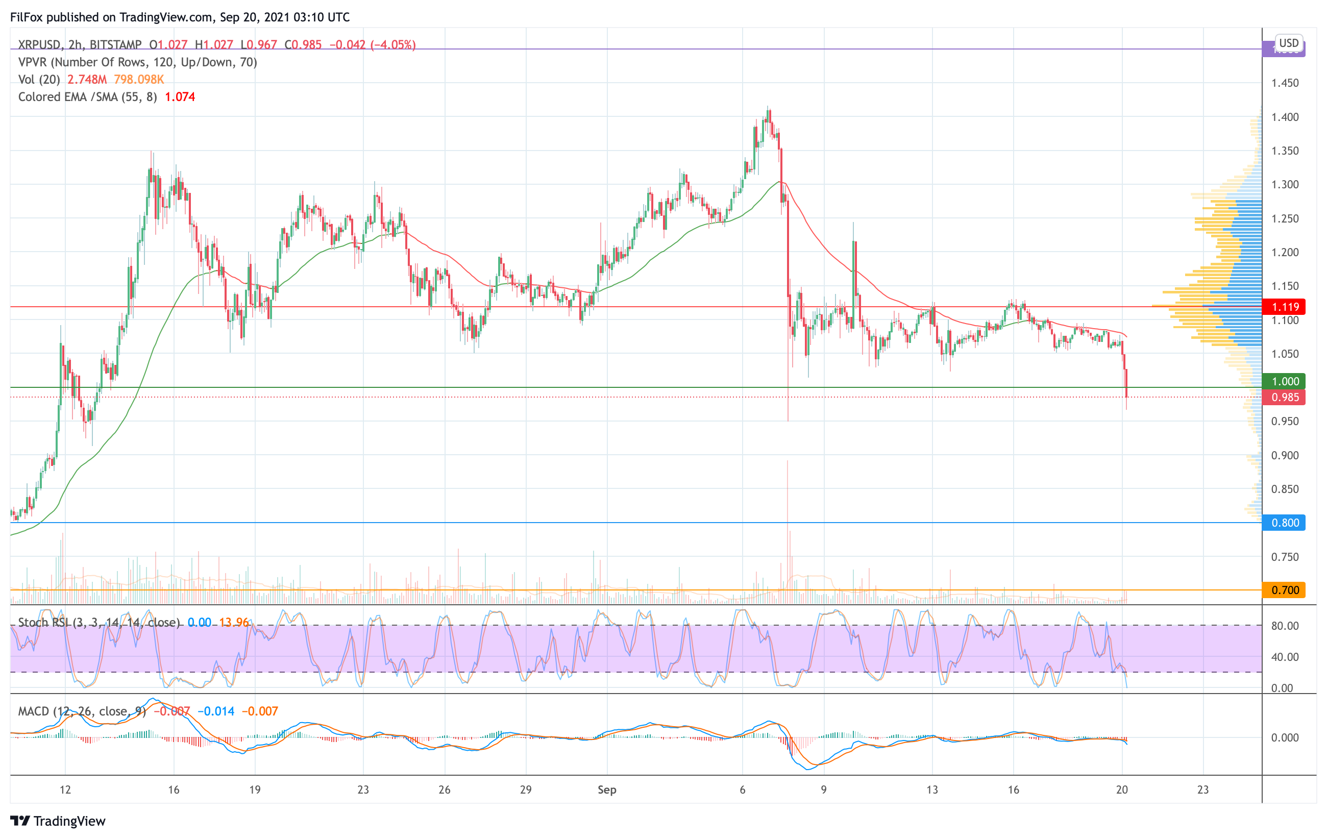На выходных цена XRP не смогла восстановиться выше уровня двухчасовой EMA55 и откатилась в зону недельного минимума.