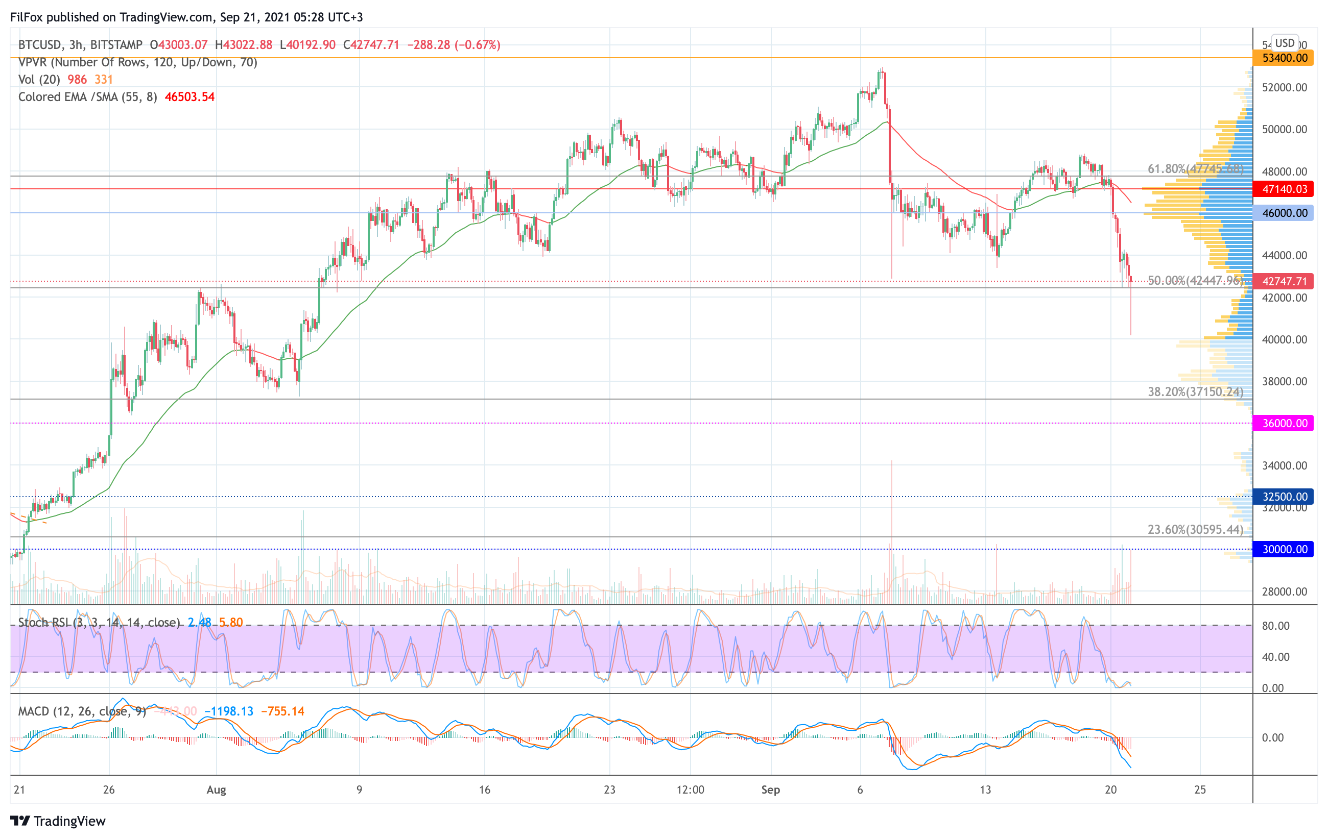 Вчера медвежье давление усилилось и цена биткоина достигла пятидесятипроцентного уровня фибоначчи (42447.96 USD). До конца дня пара удерживалась выше него, но сегодня ночью бычий импульс пробил эту поддержку, и цена BTC установила новый месячный минимум в районе отметки 40190.00 USD.