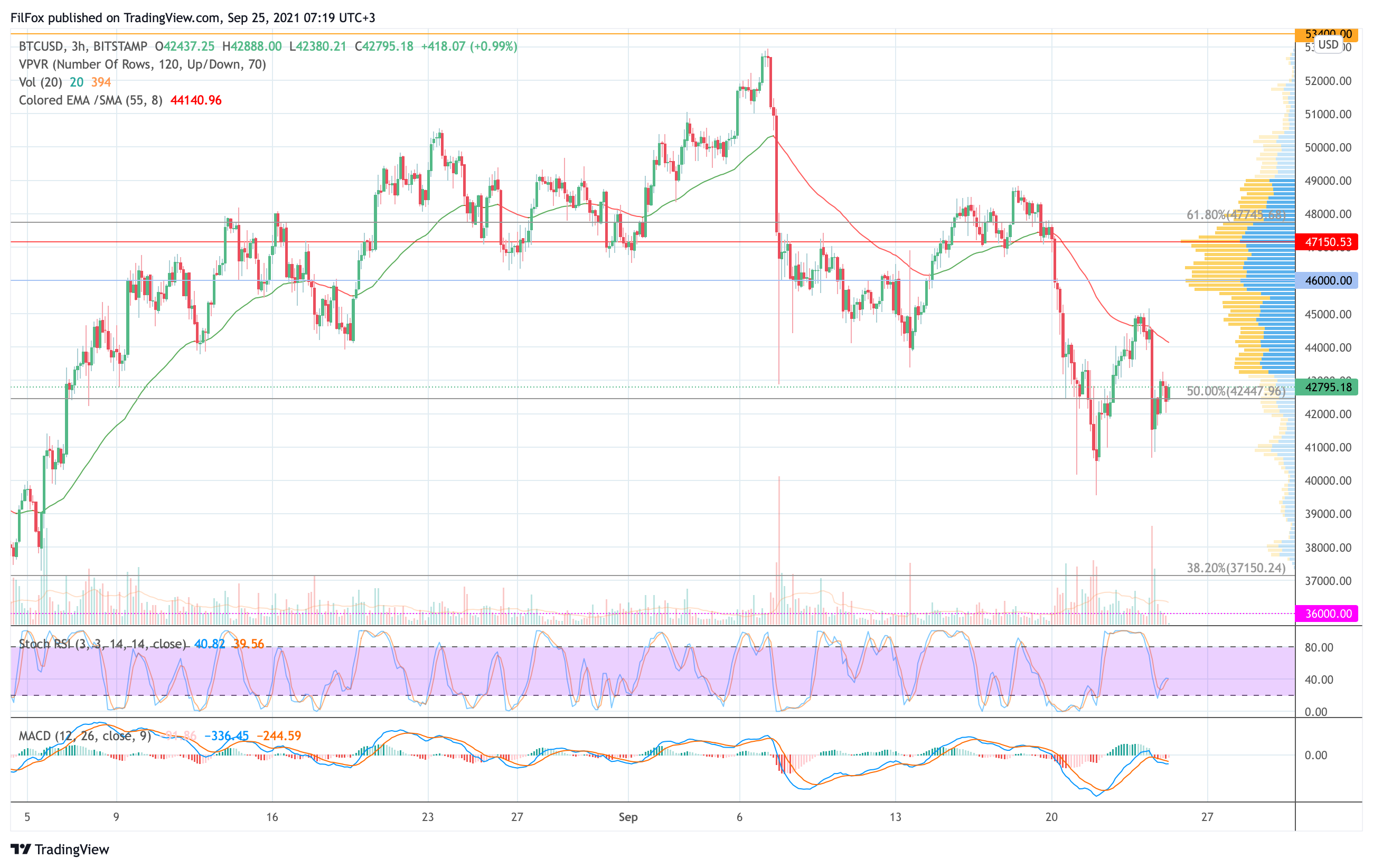 Во второй половине дня объёмы торгов сократились и цена восстановилась выше 50% фибо (42447.96 USD). Ночью этот уровень фибоначчи удержал пару в узкой боковой консолидации.