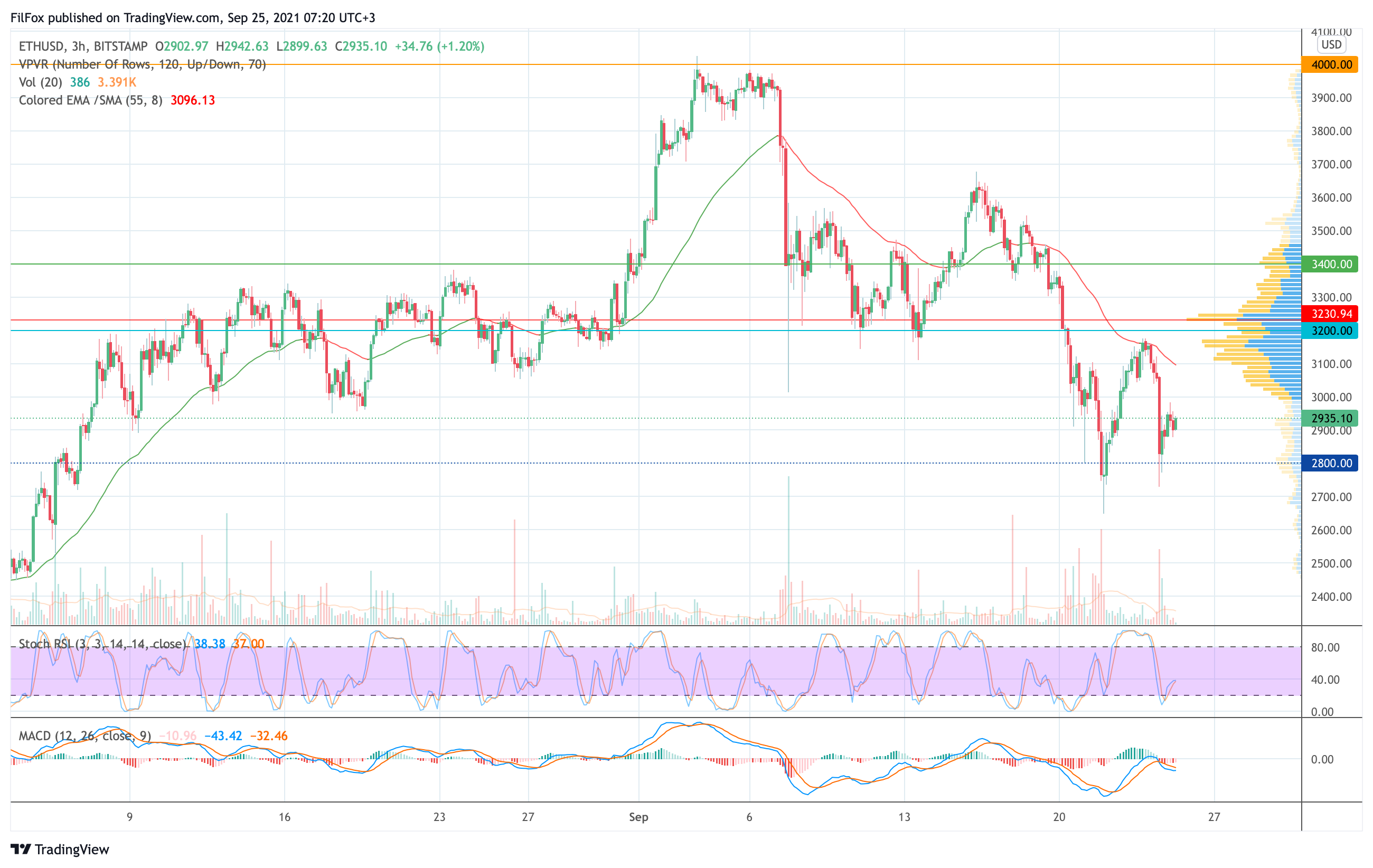 Вчера утром цена ETH не смогла продолжить восстановление к уровню 3200.00 USD. Продавцы ещё в первой половине дня оттеснили пару в область психологической отметки 3000.00 USD, а потом сильным медвежьим импульсом прорвали этот уровень и протестировали поддержку 2800.00 USD.