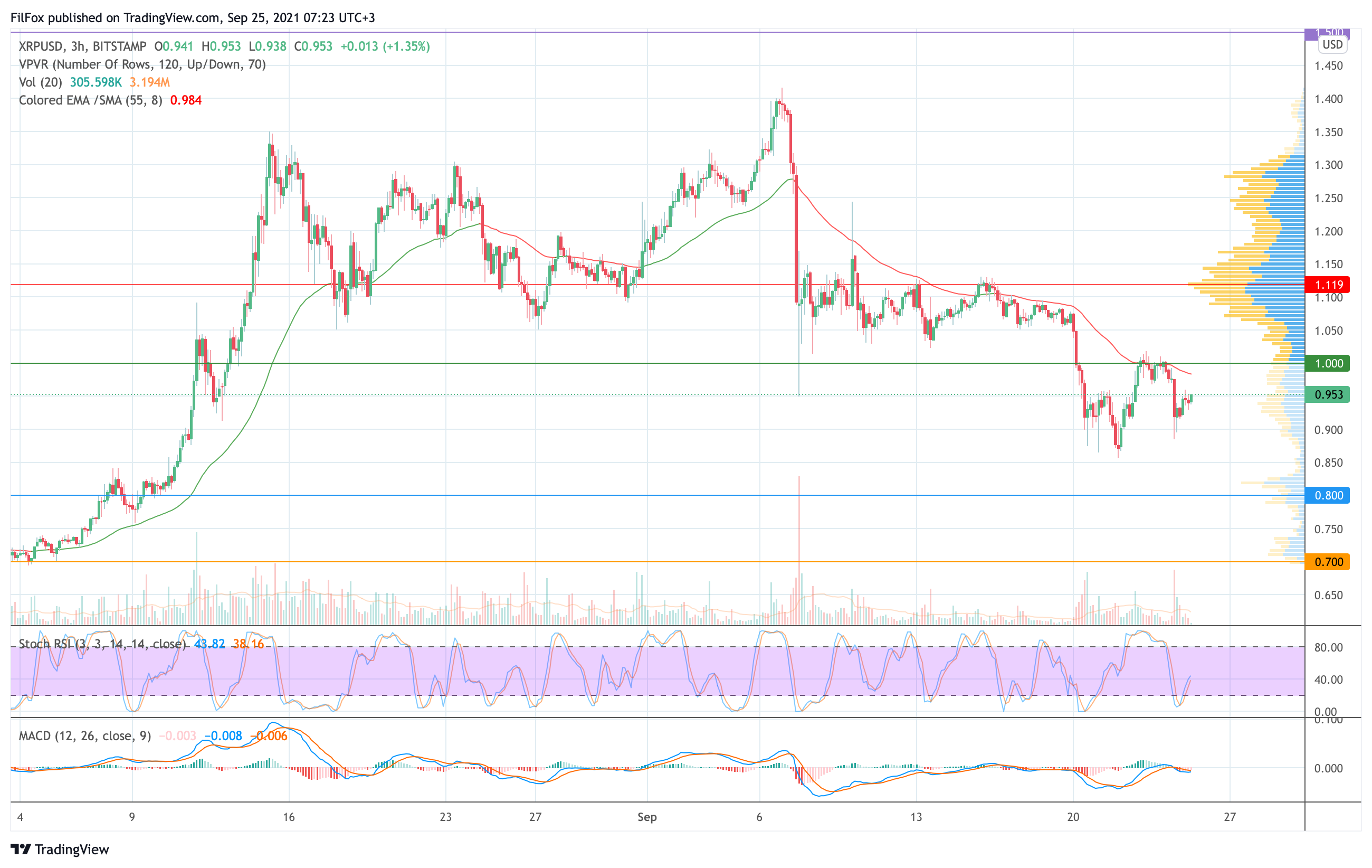 Вчера утром покупатели на малых объёмах оттеснили цену XRP от психологического уровня 1.00 USD в район отметки 0.970 USD. Потом последовал медвежий импульс, который протестировал поддержку 0.900 USD. Дневной минимум оказался в точке 0.886 USD.