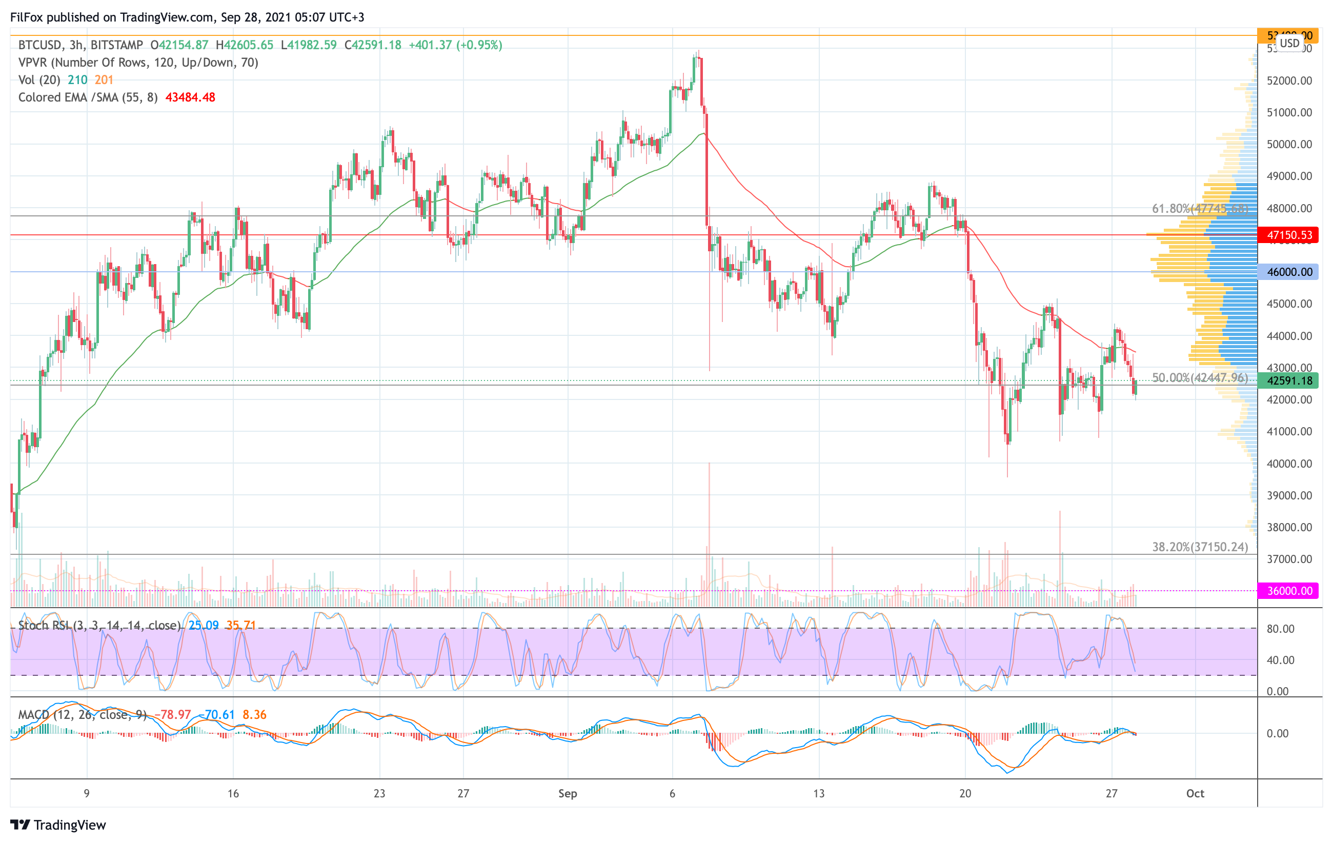 Вчера утром покупателям не удалось нарастить объёмы, и в течение дня цена биткоина плавно снижалась к пятидесятипроцентному уровню фибоначчи (42447.96 USD).