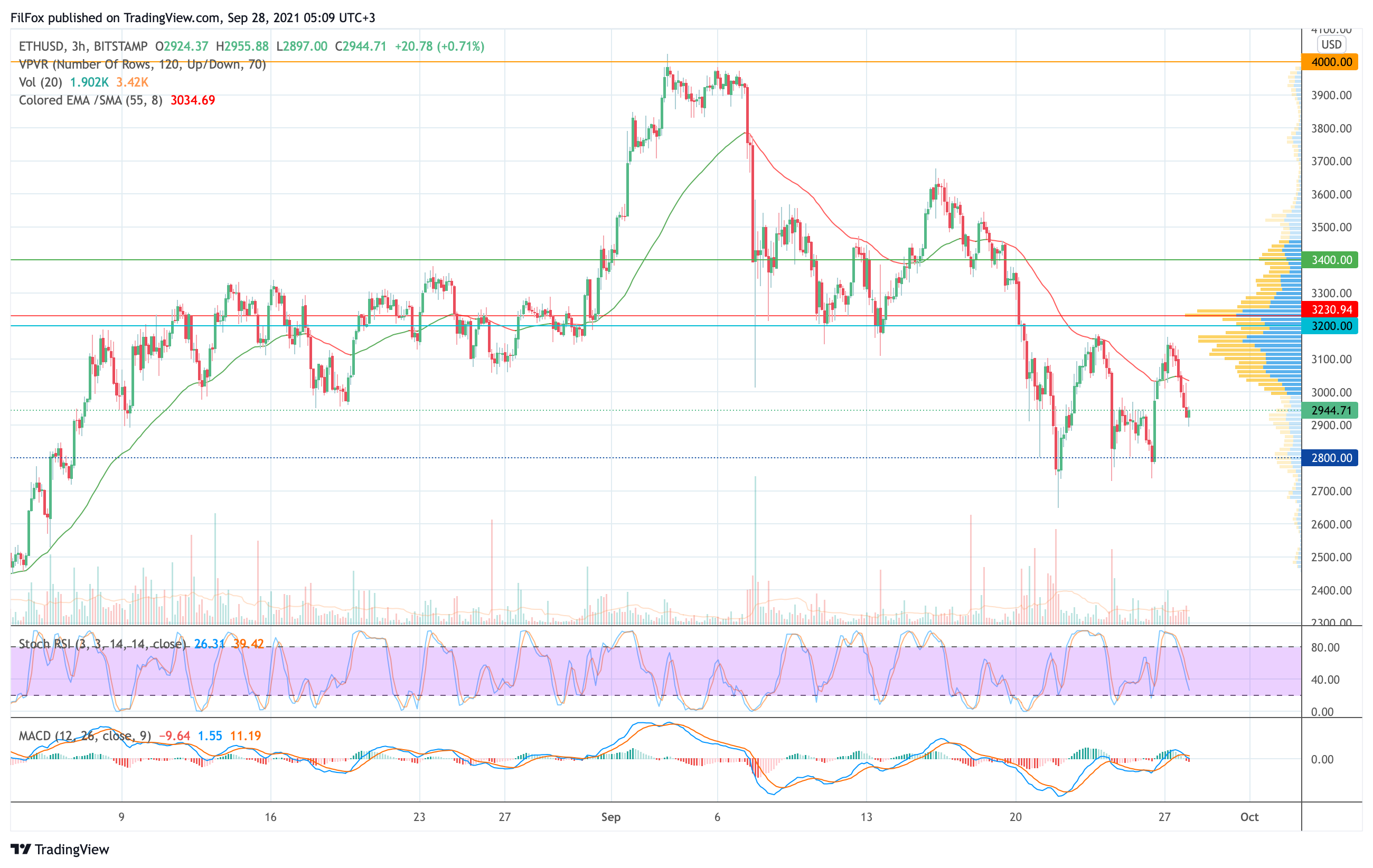 Вчера утром цена Ethereum не смогла продолжить восстановление к сопротивлению 3200.00 USD. Плотный прессинг со стороны продавцов откатил пару к психологической отметке 3000.00 USD, а вечером медведи усилили натиск и на сегодняшнее утро пара протестировала уровень 2900.00 USD.