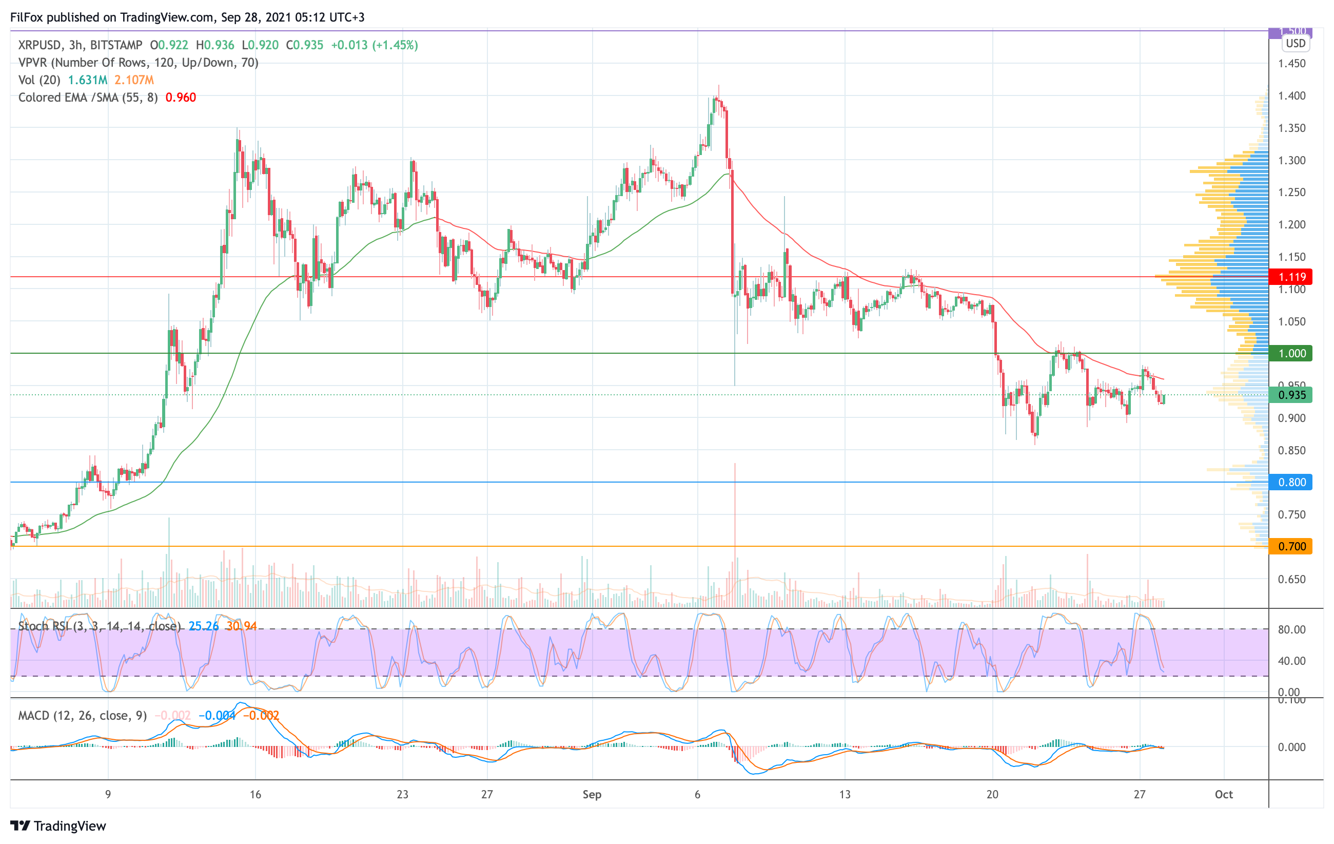 Вчера утром восстановление цены XRP остановилось в точке 0.982 USD. В течение дня продавцы вернули пару ниже трёхчасовой EMA55, а ночью снижение продолжилось к уровню 0.922 USD.