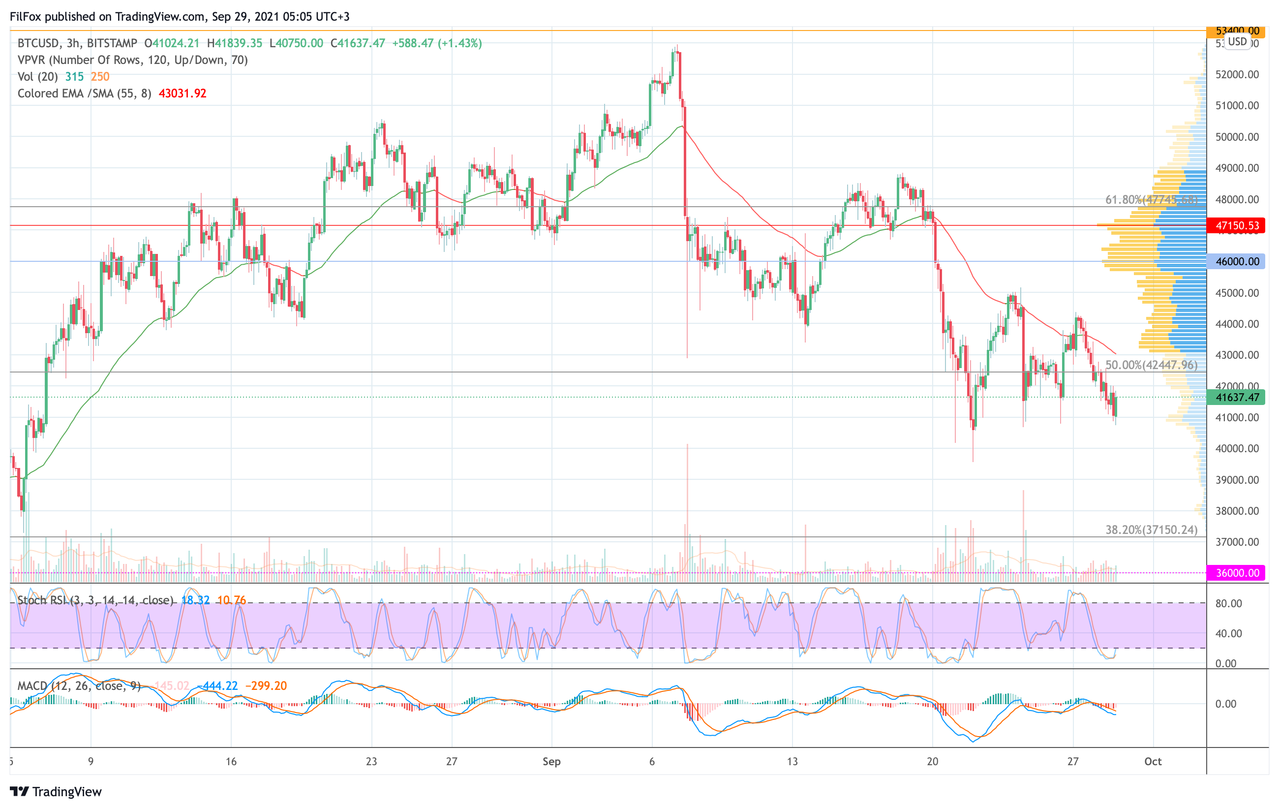 Вчера утром цена биткоина не смогла закрепиться в консолидации на уровне 50% фибо (42447.96 USD) и к завершению дня откатилась в зону минимума прошлой недели (40800.00 USD).