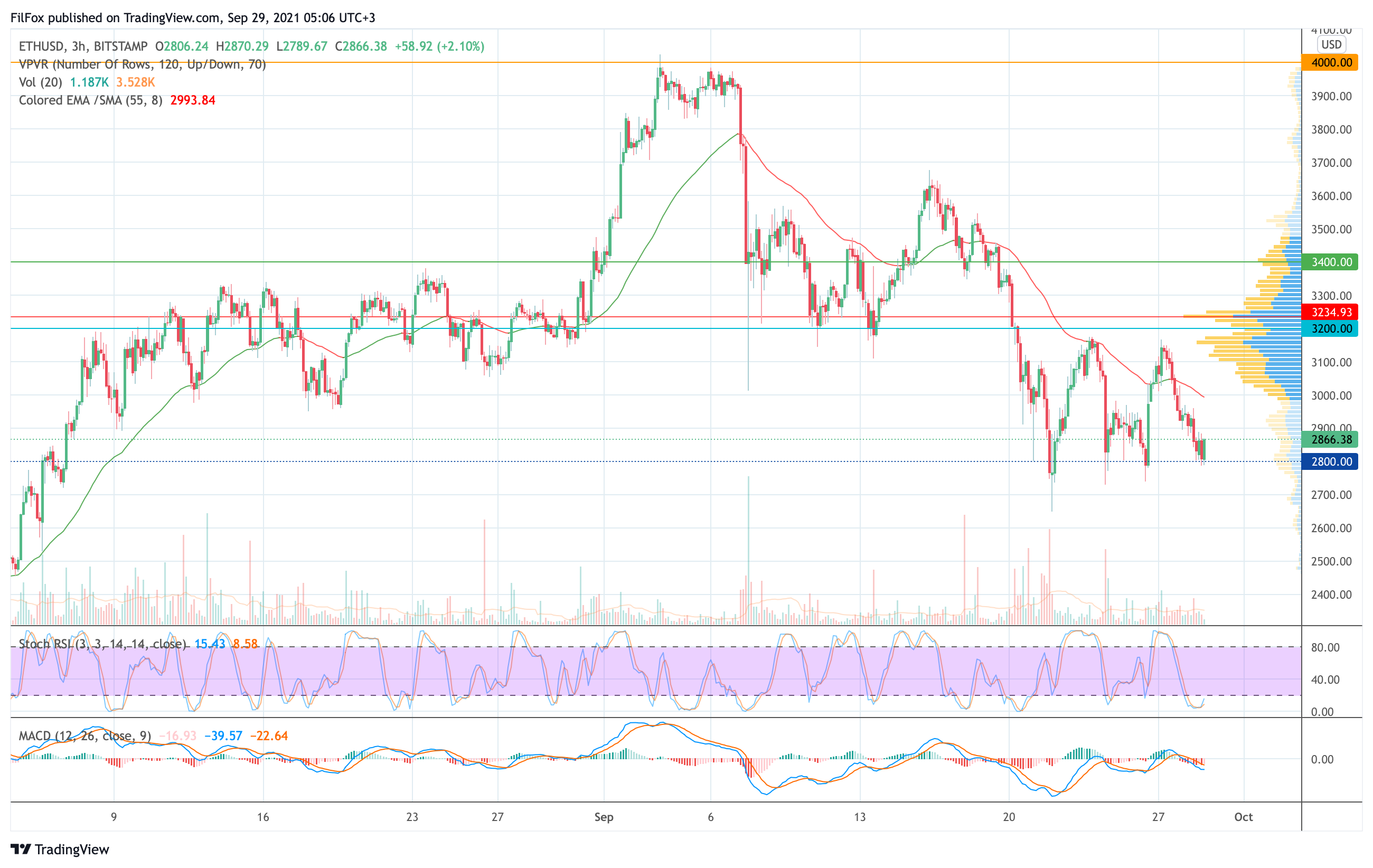 Сегодня пара может восстановиться в область трёхчасовой EMA55, однако восстановление в район трёх тысяч вызовет ответную реакцию продавцов в виде роста объёмов продаж. Такой медвежий импульс способен пробить мощную поддержку 2800.00 USD и откатить пару в зону сентябрьского минимума (2650.00 USD).