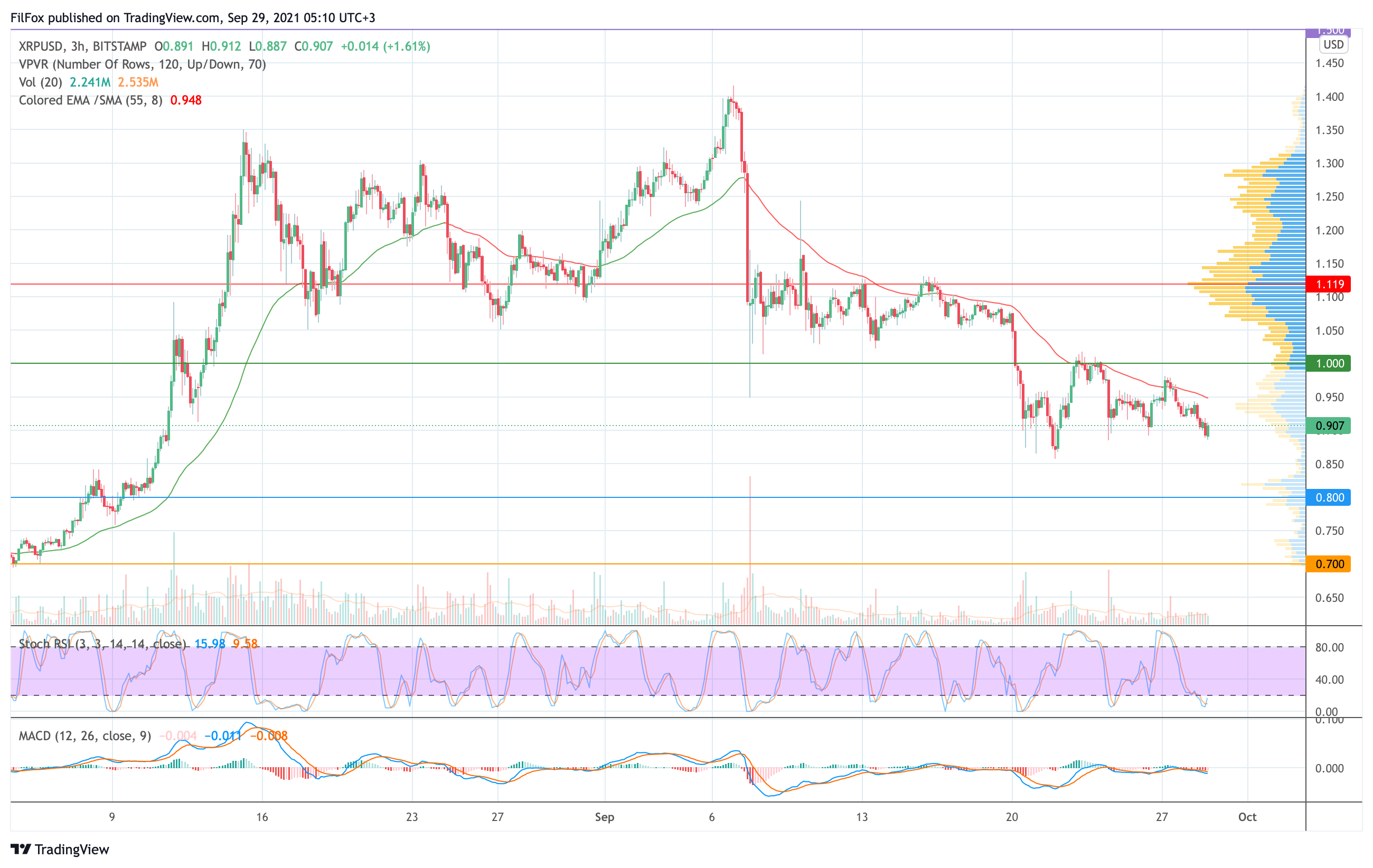 Вчера большую часть дня цена XRP не опускалась ниже отметки 0.920 USD. Вечером продавцам всё же удалось пробить этот слабый уровень поддержки, а ночью пара опустилась в зону минимума прошлой недели (0.886 USD).
