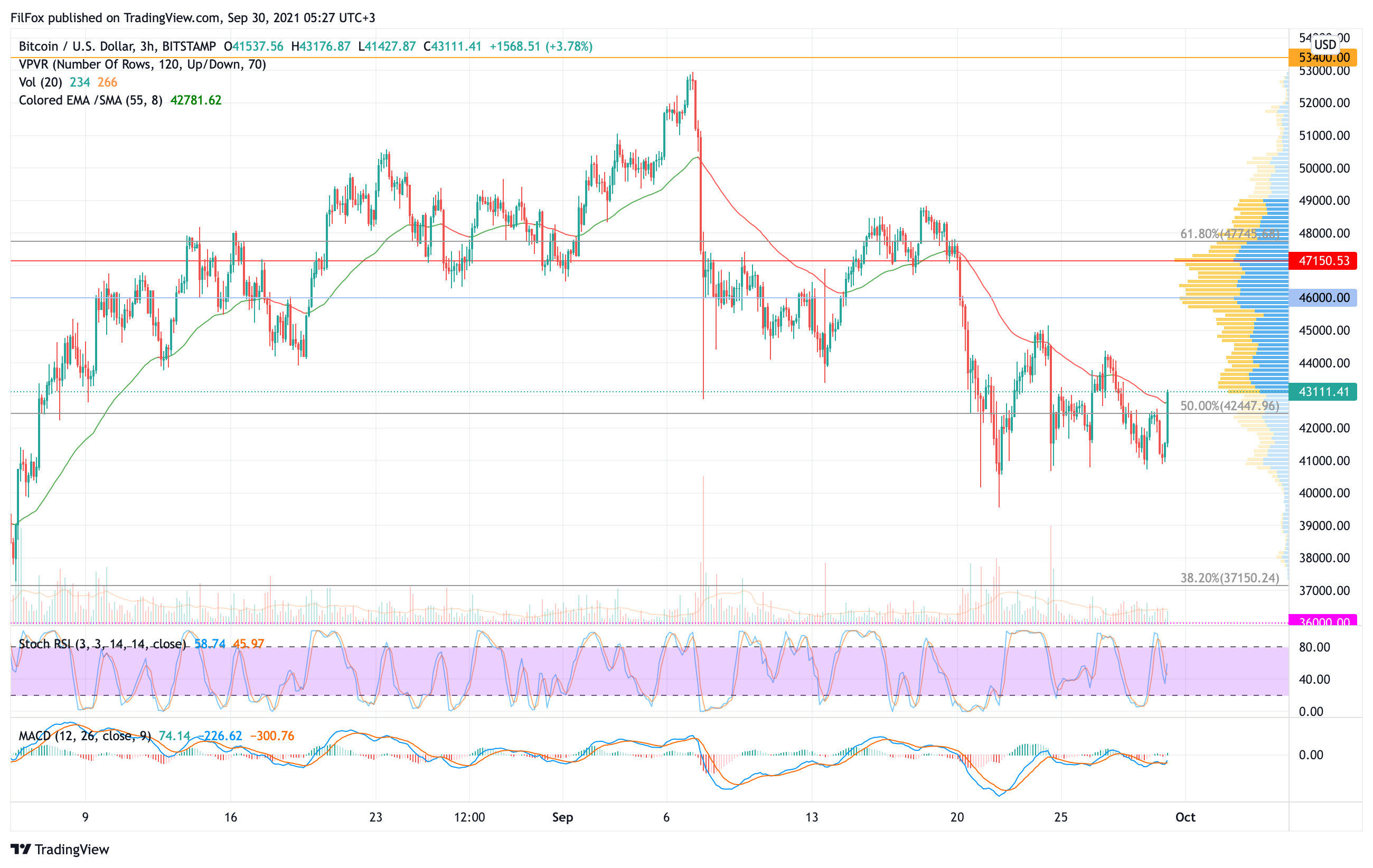 Вечером продавцы перехватили инициативу и к завершению дня пара вернулась в зону недельного минимума. Сегодня ночью откат остановился и быки повторили попытку прорваться выше пятидесятипроцентного уровня фибоначчи (42447.96 USD). Объёмы покупок чуть больше среднего уровня обеспечили прорыв 50% фибо и восстановление в область 43200.00 USD.