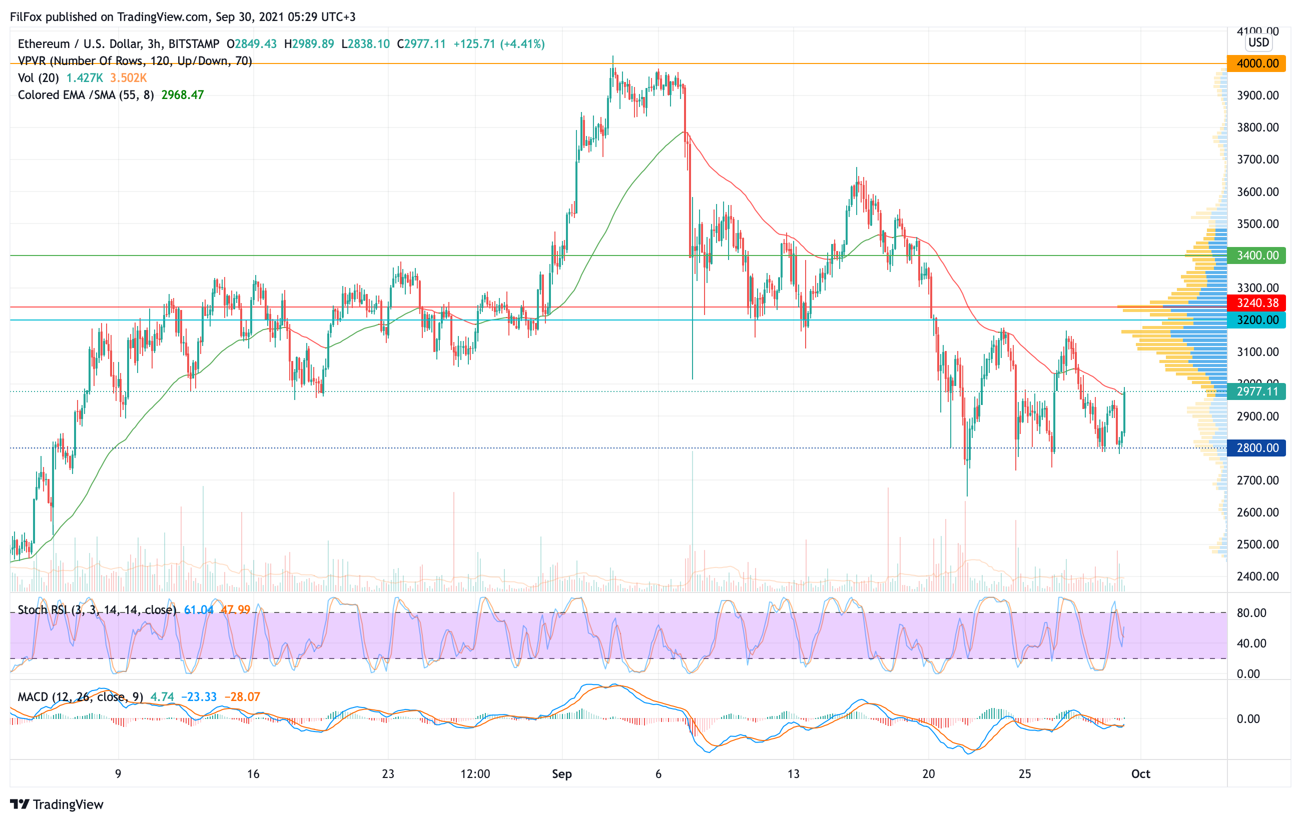 Вчера утром цена Ethereum восстановилась в область трёхчасовой EMA55, но во второй половине дня продавцы вернули пару к поддержке 2800.00 USD.