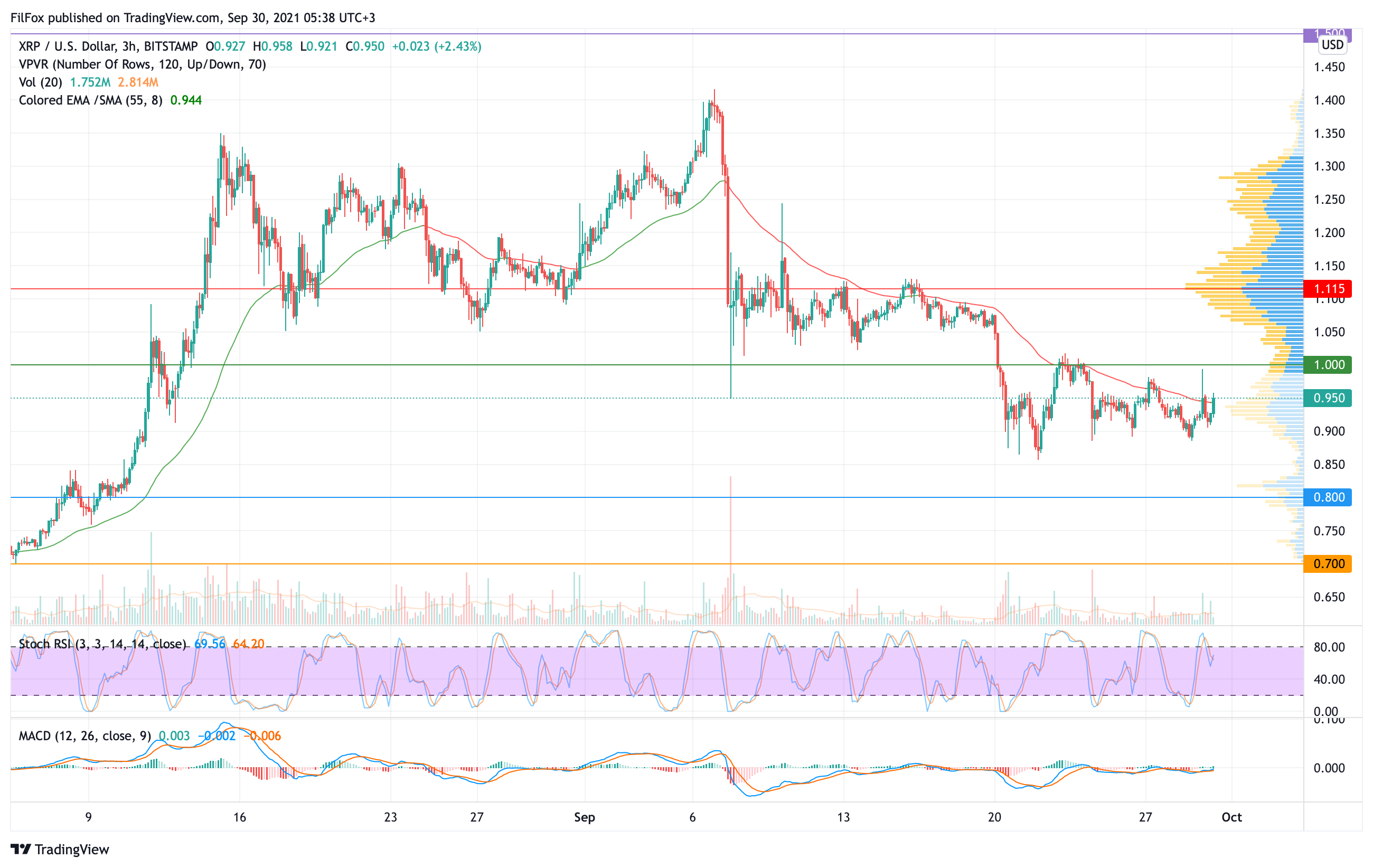 Вчера в первой половине дня цена XRP восстановилась в область средних цен. Вечером покупатели сформировали довольно мощный бычий импульс и попытались протестировать психологический уровень 1.00 USD. Однако, после дневного максимума в точке 0.994 USD цена начала стремительно падать, пока не откатилась ниже трёхчасовой EMA55.