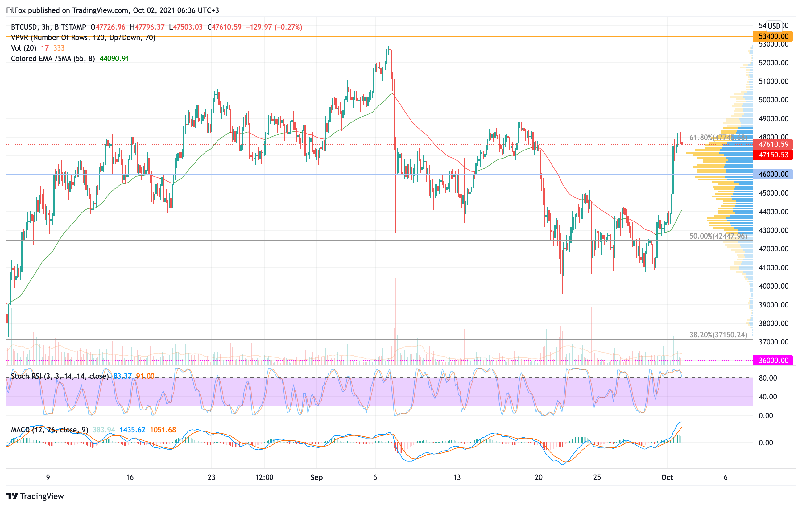 Вчера цена биткоина смогла удержаться выше трёхчасовой EMA55. Днём покупатели сформировали мощный бычий импульс, который пробил зону сопротивления $45000 - $46000. Во второй половине дня пара протестировала уровень 61.8% фибо (47745.68 USD).
