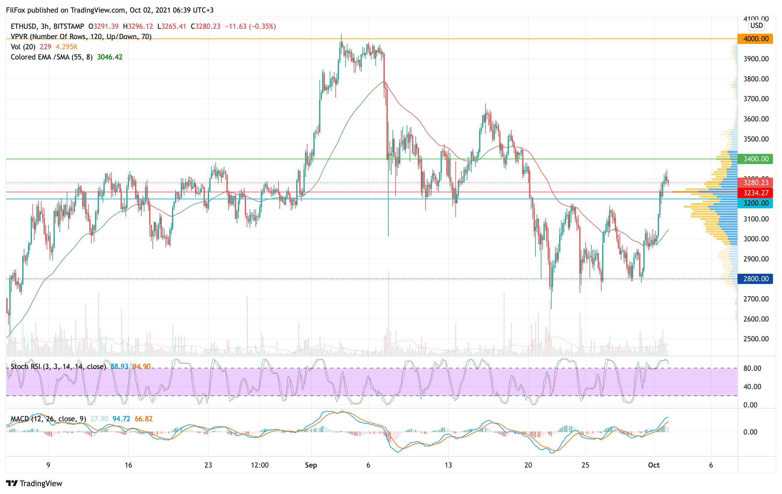 Вчера утром медведи не смогли продавить трёхчасовую скользящую среднюю EMA55. Цена Ethereum воспользовалась поддержкой в этой области и продолжила восстановление. Днём пара успешно преодолела сопротивление 3200.00 USD, а ночью установила локальный максимум в точке 3345.00 USD.