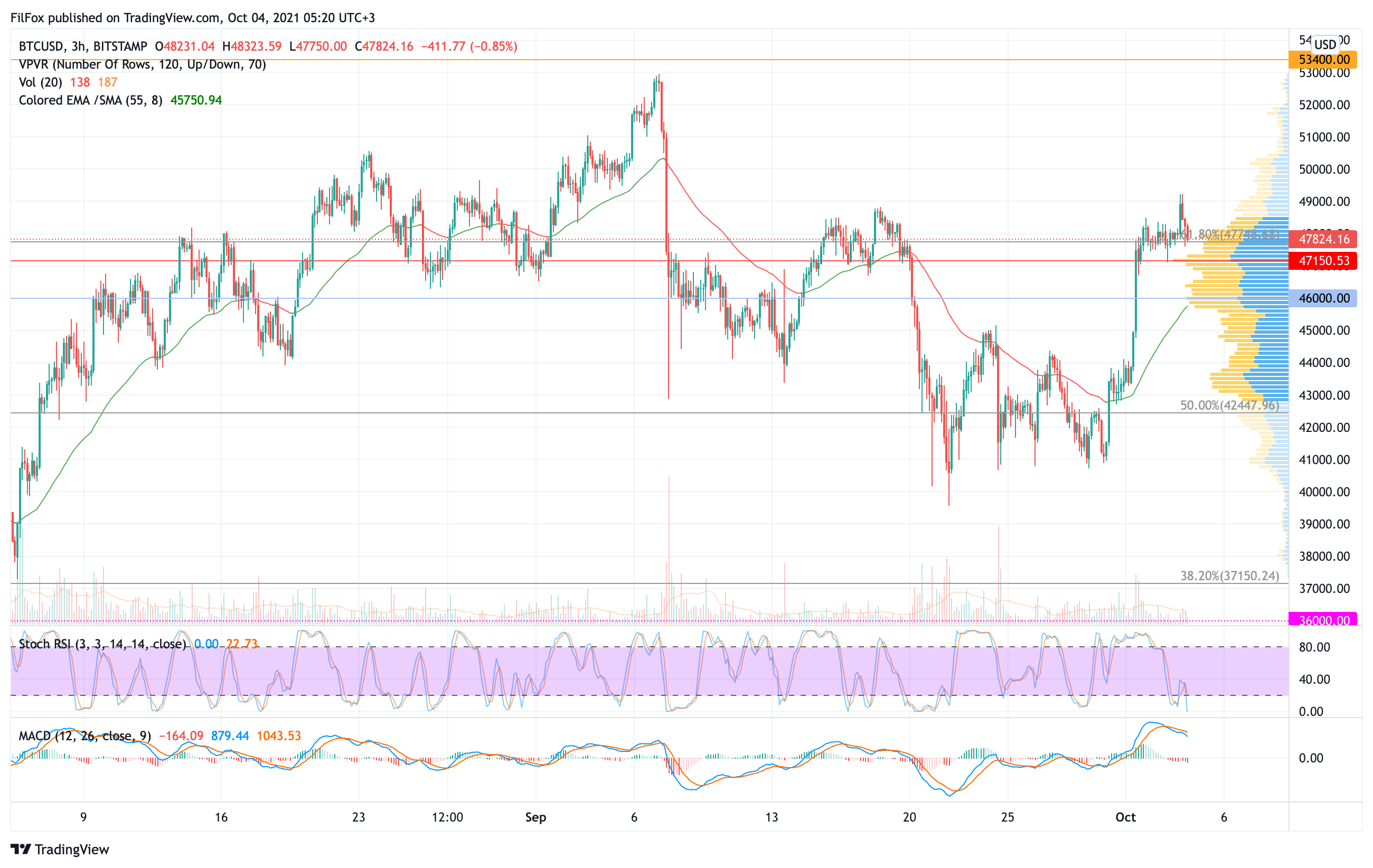 В минувшую субботу линия POC смогла удержать цену биткоина от глубокого снижения и выступила в качестве уровня поддержки, пока пара пыталась консолидироваться на уровне 61.8% фибо (47745.68 USD).