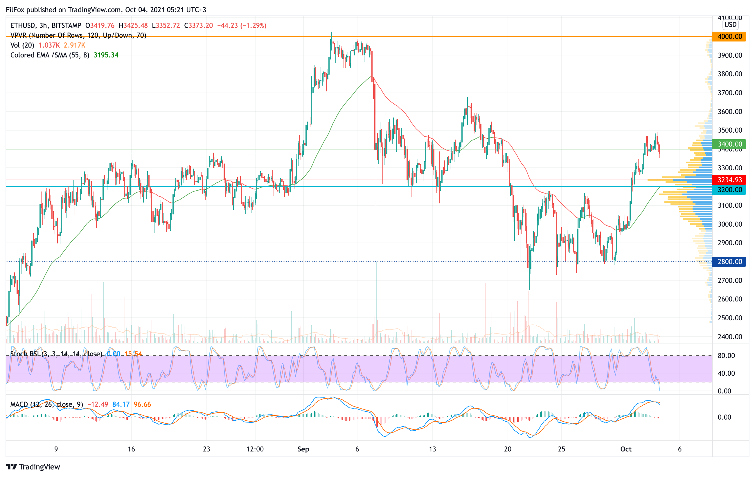 Однако, в воскресенье быки смогли продолжить наступление и к концу недели установили октябрьский максимум в точке 3491.00 USD. Сегодня ночью объёмы покупок сократились, а цена эфира вновь вернулась ниже уровня 3400.00 USD.