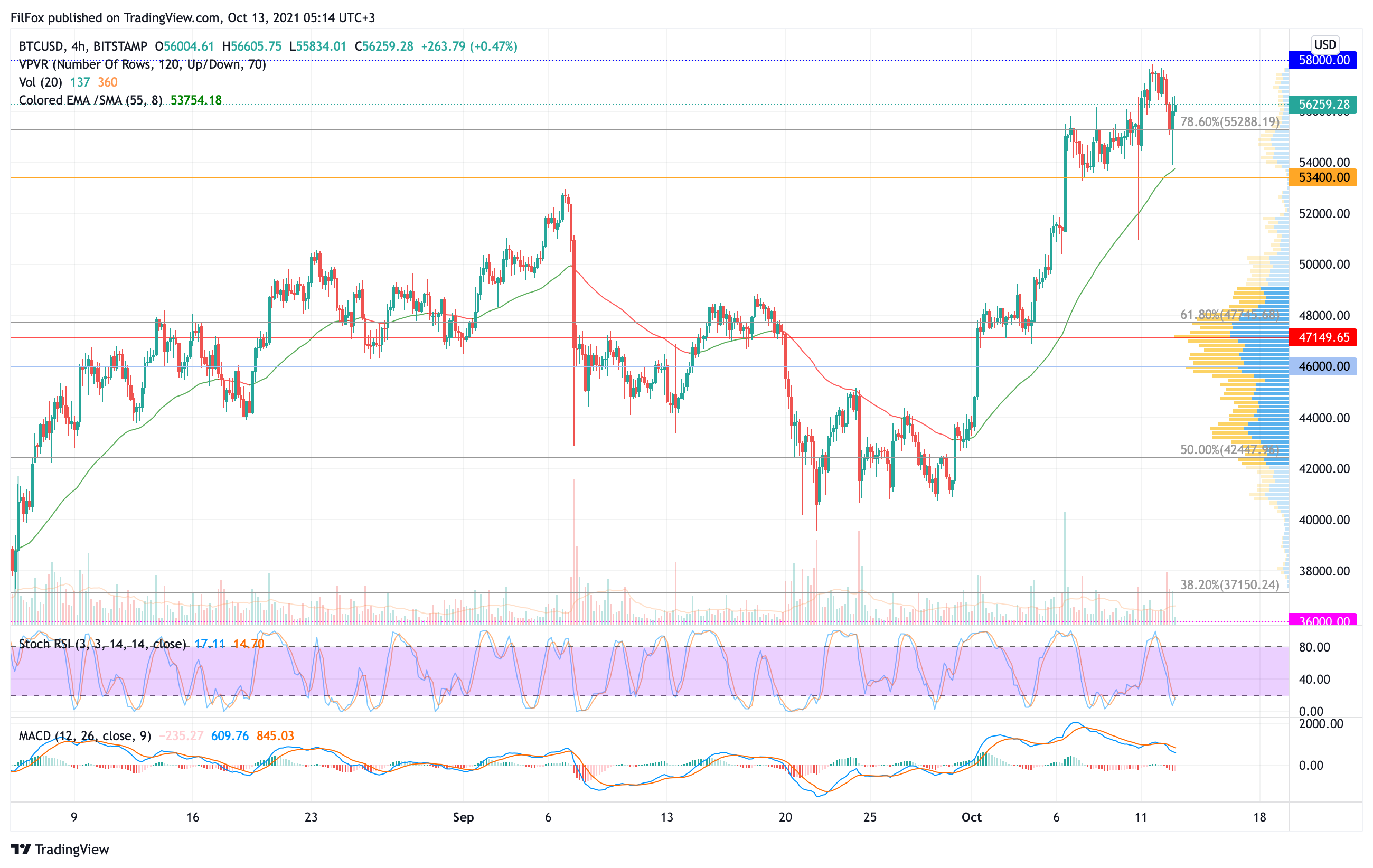 После обеда объёмы продаж начали расти, и пара постепенно откатилась к 78.6% фибо (55288.19 USD), а поздно ночью цена биткоина протестировала уровень 54000.00 USD.