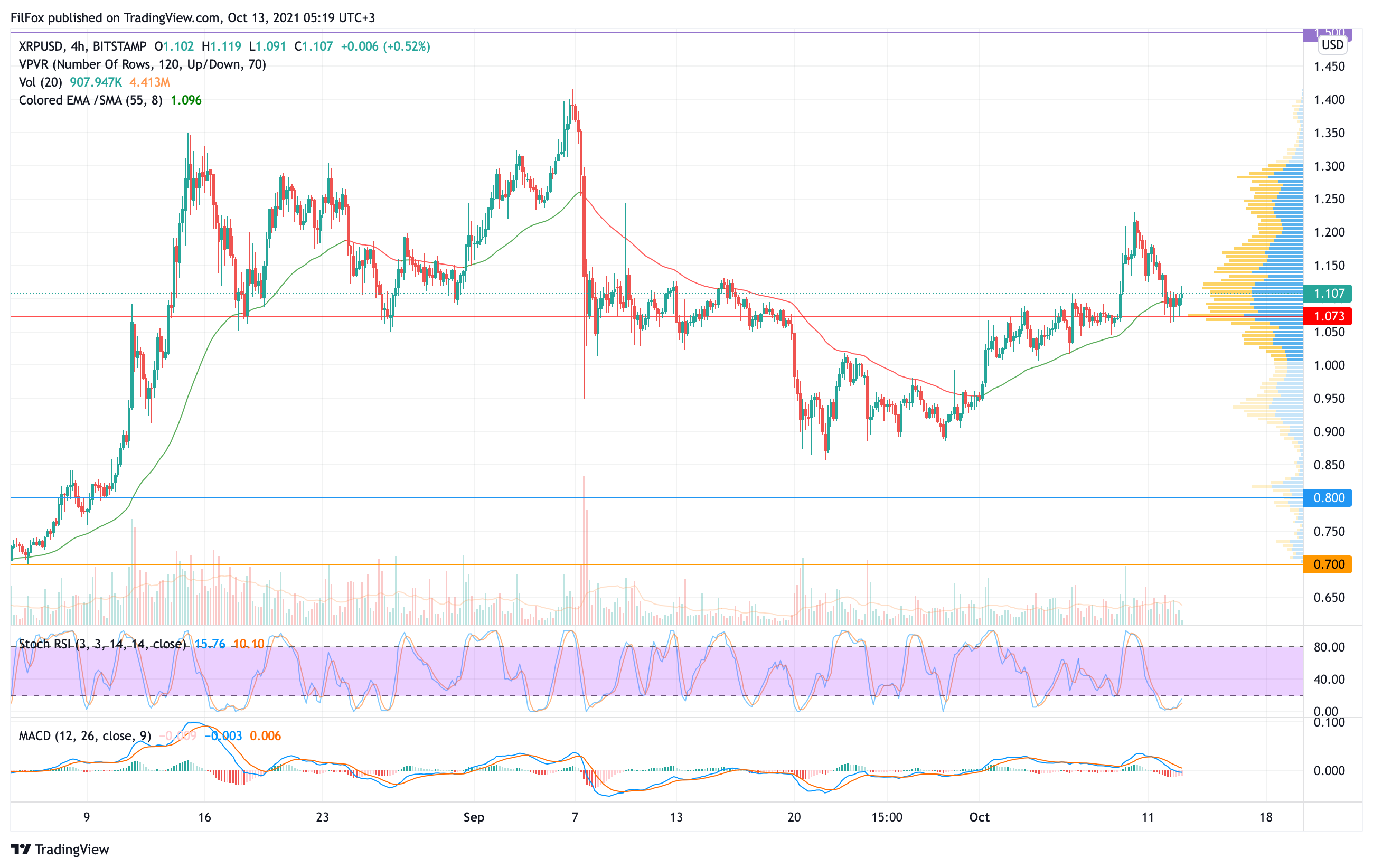 Вечером началось восстановление, в результате которого пара поднялась выше четырёхчасовой EMA55. На сегодняшнее утро цена XRP протестировала уровень 1.120 USD и в течение дня может продолжить рост в район отметки 1.140 USD.