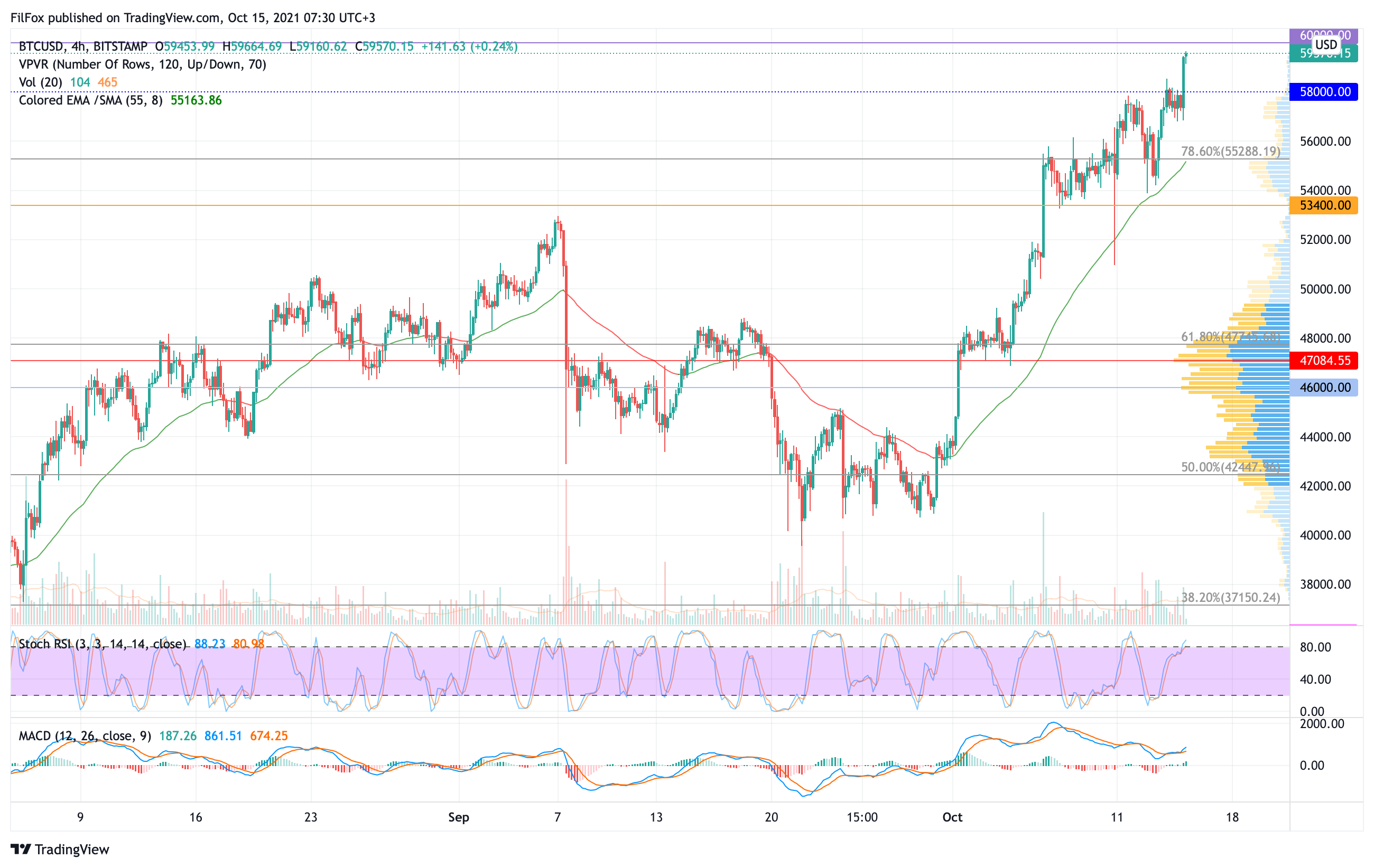 Сегодня быки уже успели прорвать сопротивление 58000.00 USD и установить новый месячный максимум в точке 60000.00 USD.