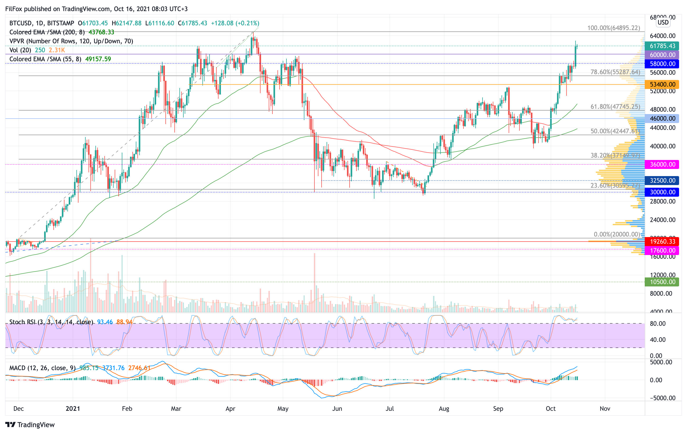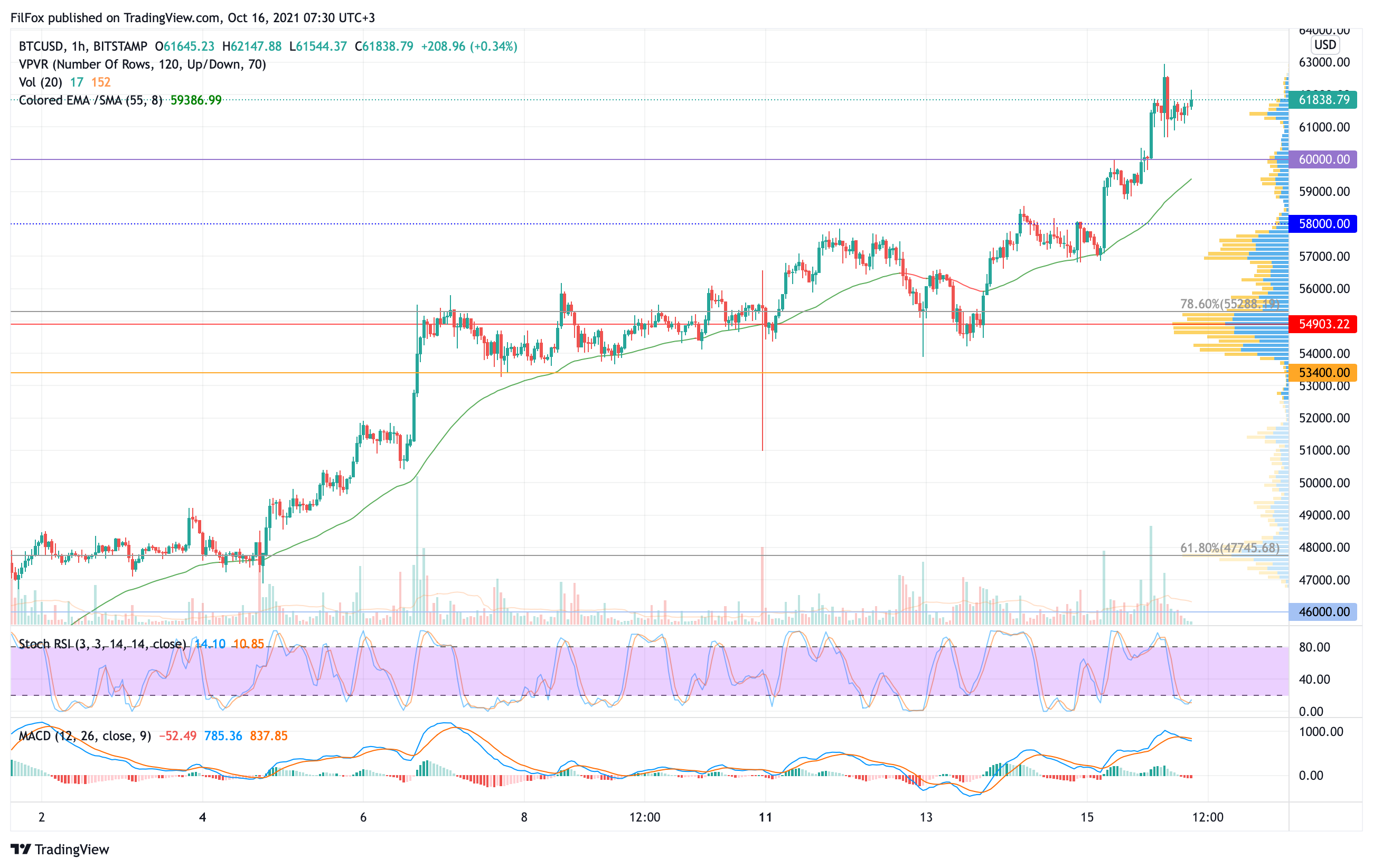 На дневном тайм-фрейме видно, что с начала октября индикаторные линии Stoch RSI не покидают зону перекупленности. Полагаем, что после обновления исторического максимума медведи попытаются откатить цену к отметке 58000.00 USD.