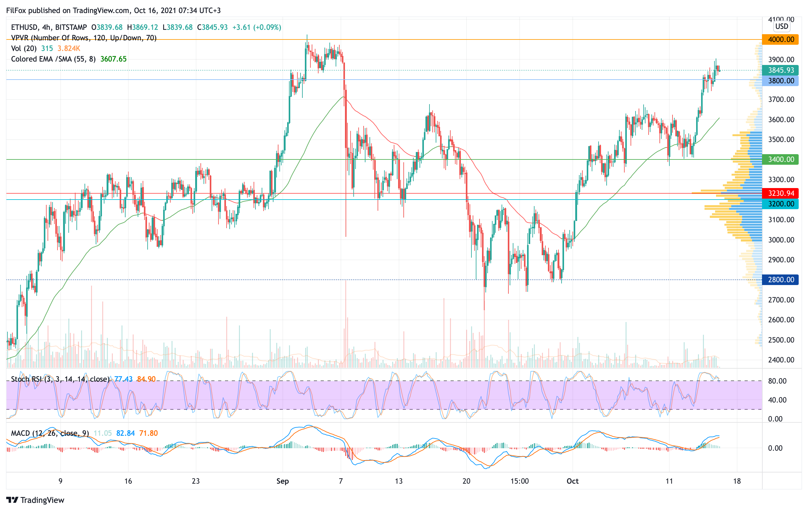 Вчера в первой половине дня цена Ethereum консолидировалась в боковом диапазоне с поддержкой в районе 3800.00 USD. Несмотря на то, что продавцам удалось откатить цену ниже уровня поддержки, вечером покупатели вернули пару в зону месячного максимума и продолжили рост.