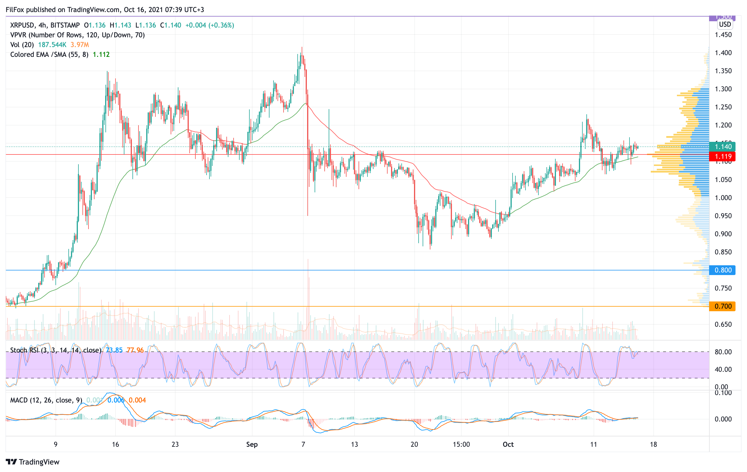 Вчера утром подъём пары XRP/USD в район отметки 1.160 USD вызвал медвежий импульс, который заставил протестировать четырёхчасовую EMA55.